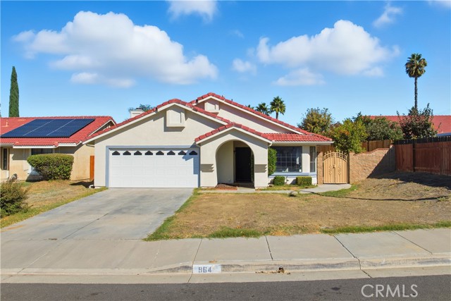 Welcome to 964 Coquina Street, a beautifully refreshed home nestled in a quiet Hemet neighborhood. As you step inside, you're greeted by a formal living room that sets the tone for the home's inviting and spacious layout. This residence features three well-sized bedrooms plus a versatile office or den — perfect for remote work, hobbies, or extra living space. The master bedroom includes a private entrance to the backyard, creating a peaceful retreat with easy outdoor access. Flooring throughout the home includes durable laminate in main areas and soft carpet in the bedrooms. While a separate family room with a cozy fireplace adds warmth and charm. The interior has been freshly painted, and stylish shutters accent the main living spaces. The open front yard offers a blank canvas for your landscaping vision. Step outside to enjoy a covered back patio perfect for relaxing or entertaining. The backyard is adorned with fruit trees and designed for low-maintenance living. The exterior has also been recently painted, enhancing curb appeal and giving the home a clean, modern look. Conveniently located near Elementary and Middle schools, shopping centers, and with easy access to Domenigoni Parkway, this move-in-ready home offers comfort, flexibility, and a prime location. Come experience all it has to offer.