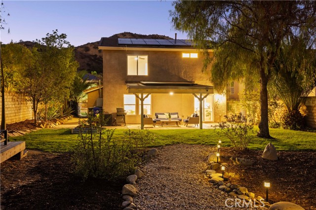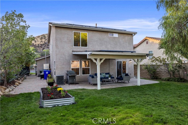 Welcome to 28120 Gibraltar Lane — a beautifully updated Cambridge Collection home in the highly sought-after Hasley Hills community of Castaic. With fresh paint, new landscaping, and breathtaking views of the mountains and valley, this 3-bedroom, 3-bath residence blends style, comfort, and location in one stunning package. Step inside to an inviting open floor plan featuring upgraded flooring, crown molding, tall baseboards, custom shiplap accent walls, recessed lighting, and a custom fireplace that sets the perfect tone for both relaxation and entertaining. The bright kitchen is the heart of the home, boasting granite countertops, stainless steel appliances, a pantry, a breakfast bar, a cozy breakfast nook, and a sleek custom-built-in refrigerator. Dining and living spaces flow seamlessly together, creating an effortless setting for gatherings large or small. Upstairs, the private primary suite offers higher ceilings, upgraded flooring, a spa-like ensuite bath with dual sinks, and a spacious walk-in closet. Two additional bedrooms share an upgraded hall bath, providing plenty of comfort and versatility. Convenience is maximized with a dedicated downstairs laundry room, while the expansive under-stair closet provides incredible storage. A storage loft above the garage adds even more space to keep everything organized. The backyard is an entertainer's dream — pool-sized and versatile, with stamped concrete, covered seating, multiple gathering areas, and mature fruit trees, including pear, two peaches, and lemon. Whether enjoying morning coffee, hosting barbecues, or unwinding at sunset, this outdoor space delivers year-round. Additional highlights include ENERGY STAR windows, central air, block fencing, front and rear sprinklers, ample storage, and a two-car attached garage. Solar panels help offset energy costs. Low HOA, no Mello Roos. All of this is ideally located near shopping, dining, schools, Castaic Lake recreation, and with quick 5 Freeway access for commuting. Move-in ready and brimming with upgrades, this home truly checks every box — spectacular views, modern finishes, thoughtful storage, and an entertainer's backyard. Don't miss your chance to experience it in person!