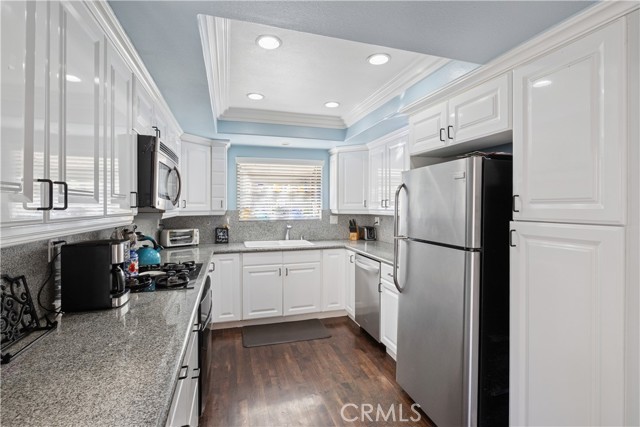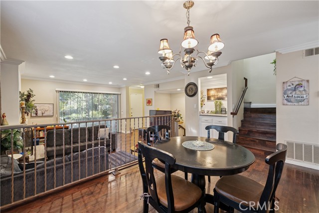 Welcome to Warner Village, where your dream tri-level townhouse awaits! This charming end unit boasts three spacious bedrooms and two and a half bathrooms, perfectly designed within an open floor plan that spans 2,022 square feet. Located in a tranquil location, you'll enjoy picturesque views of serene streams, and refreshing pools with running water right next to the front door. Step inside to discover a bright living room featuring high ceilings and a cozy fireplace. The kitchen is a chef's delight with elegant granite counters, a delightful balcony, and a convenient eating area. Entertain guests in the formal dining room that leaves a lasting impression. The upstairs bedrooms are generously sized, with the primary bedroom offering a luxurious walk-in closet and its own private balcony. Plus, a versatile utility room provides the perfect space for an office or guest room. The HOA includes water earthquake insurance cable and the internet. The B tax rolls indicate 1,631 square feet, however the builder floor plan was measured as 2022 Sq Ft including the bonus room. Buyer to verify the square footage. One year old air conditioner. New electrical panel. Enjoy the shopping,restaurants,parks and easy access to nearby freeways and beaches.