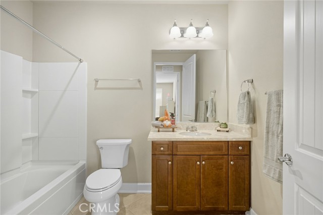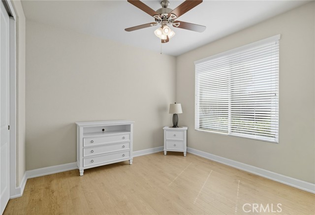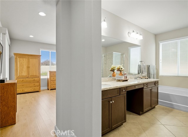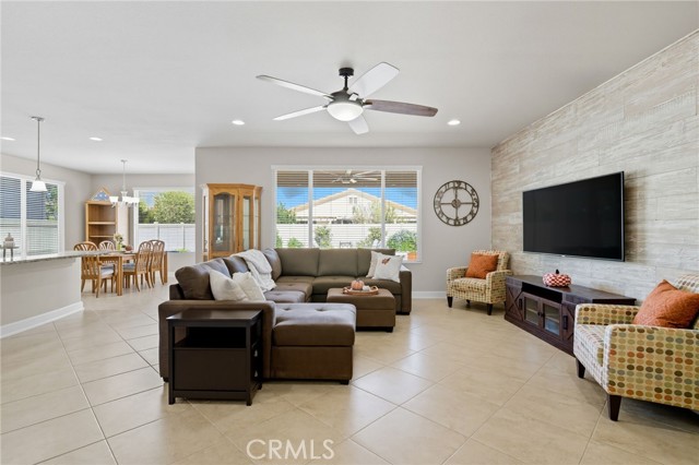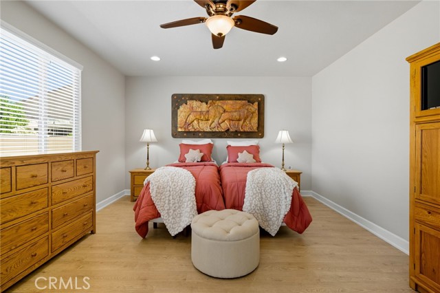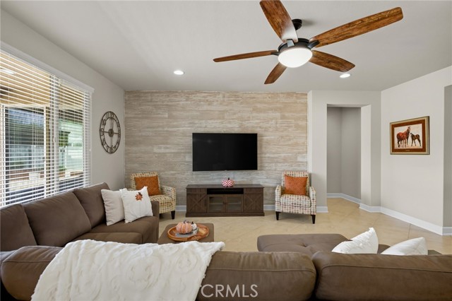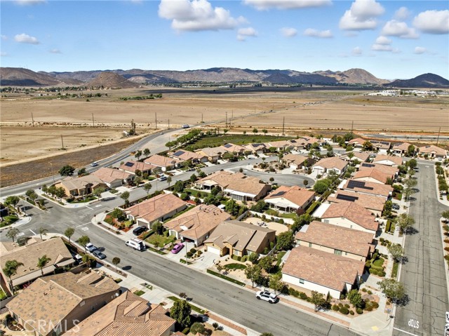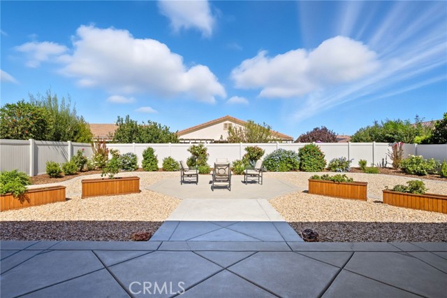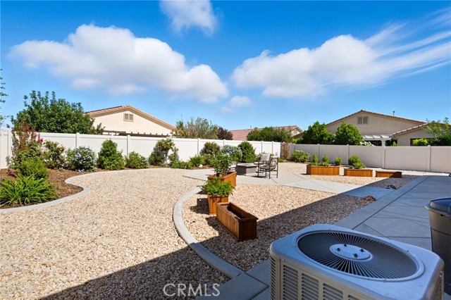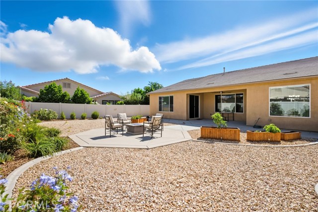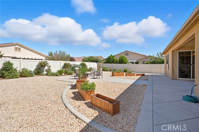 This is it — your turnkey Haven model in one of Southern California's most sought-after active adult 55+ communities. This spacious single-story offers 3 bedrooms, 2 bathrooms, and 2,030 sq. ft. of well-designed living space, plus one of the largest backyards in the neighborhood. Inside, you'll find low-maintenance 20" porcelain (installed on a diagnal) square tile flooring and an inviting open-concept layout. The gourmet kitchen is a showstopper, featuring a massive granite island with sink, walk-in pantry, and premium KitchenAid and Bosch appliances including a sleek stove hood and separate dining area. Entertain with ease thanks to the built-in wet bar with wine rack, sink, wine fridge, and abundant cabinetry. The family room shines with a modern shiplap accent wall, while the primary suite provides its own backyard access and a spa-inspired ensuite with dual sinks, soaking tub, walk-in shower, and large walk in closet with upgraded built in system. Two additional bedrooms and a full bath are located down a seperate hallway and seperated from the primary. The backyard is an entertainer's dream — complete with a covered patio and ceiling fan, stamped concrete with gas-wired firepit, lush landscaping, and vinyl fencing. Gardeners will love the six cedar planter boxes with drip irrigation, producing fresh vegetables (including green peppers) alongside mature orange and lemon trees on the side yard. Additional upgrades include: Mohawk RevWood engineered flooring in bedrooms, tankless water heater, ADA-friendly doorways, hallways and toilets, recessed LED lighting, ceiling fans in every room, interior sprinkler system, coat closet, new AC condensation pan, new sprinkler valves and extra deep garage for trucks. Living in Solera Diamond Valley means access to the award-winning Mountain View Lodge — 23,000 sq. ft. of resort-style amenities. Enjoy a state-of-the-art fitness center, indoor lap pool, spa, walking track, aerobics studio, hobby and craft rooms, ballroom, library, computer station, card room, billiards, and coffee bar. Outdoor amenities include two pools, tennis courts, bocce ball, BBQ areas, and miles of walking trails. Not to mention the monthly "View" Magazine offering residents a calendar of planned social events! Don't miss this opportunity to own a beautifully upgraded home with one of the community's best backyards in a vibrant, active setting!