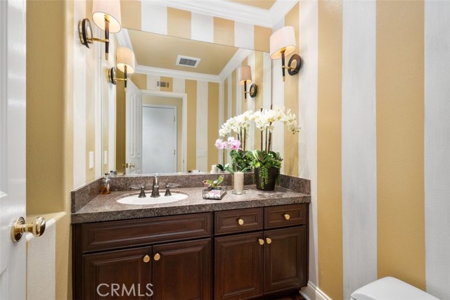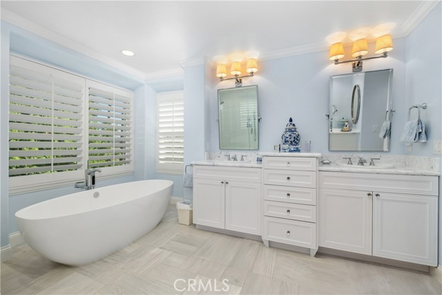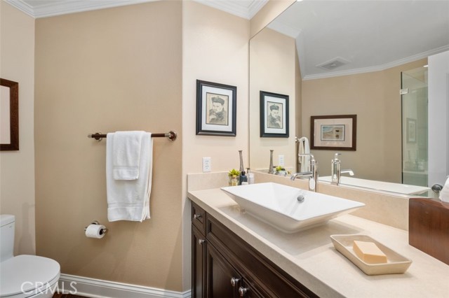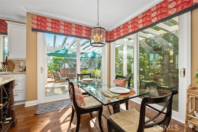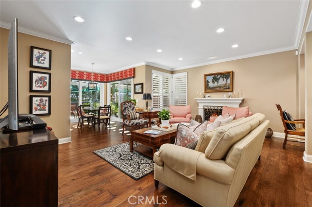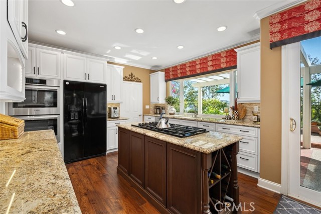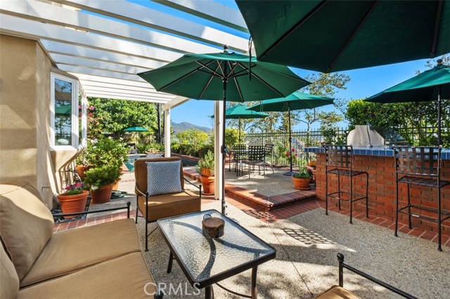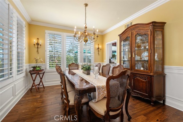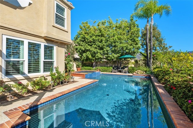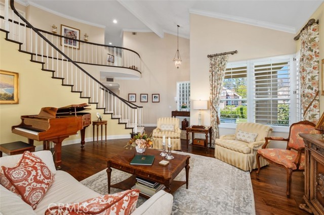 Welcome home to "Casa Loma Alta del Sur" - the house on the south hill! This stunning 4 bedroom, 3 1/2 bathroom, 3 car garage home has been beautifully updated with impeccable taste and quality finishes and is located at the end of a cul-de-sac street in Dove Canyon, a sought-after private gated golf community with a Jack Nicklaus Signature 18 hole golf course*The minute you walk in to the entry and living room, you will feel enveloped in this exceptional residence as you look around at the spiral staircase with white spindles and stained cap, high ceilings, custom woodwork, gorgeous dark wood floor, high-end carpet, plantation shutters, glass block windows and so much more*The dining room is beautiful with a custom wood frame entry inviting you in, and wainscotting on 3 walls*The remodeled kitchen has custom Omega white cabinets with a coffee wash, granite countertops, quartz and stone full backsplashes, a large center island with a 6-burner black Decor down-draft cooktop and a wine rack*There is a walk-in pantry and high-end appliances including a Kitchen Aid refrigerator and Bosch double ovens, and the adjacent breakfast room has 2 Renaissance sliding doors to bring in the light*The warm family room has a fireplace, a custom built-in desk and wet bar*Travel up the staircase to enter the double doors to a gorgeous primary suite with retreat, 2 closets and a remodeled bathroom with slipper tub, large shower with frameless enclosure, custom Omega white cabinetry with divided vanities, marble countertops and Baldwin crystal knobs*Down the hallway you'll find 3 secondary bedrooms, 1 with its own remodeled bathroom with a shower, refaced cabinets and a vessel sink and the other 2 bedrooms share a remodeled bathroom with a free-standing white wood vanity with quartzite countertop and a tub/shower with a newer shower enclosure*Features include newer double-paned windows, newer HVAC, concrete tile roof, Ecobee thermostat system, Toto and Kohler toilets and sinks, Restoration Hardware mirrors and lighting, mirrored closet doors, and much more*Enjoy your private backyard w/large pool & spa w/dark Pebbletech finish, custom-built brick & tile dining center w/Viking stainless steel barbeque & refrigerator, a newer patio cover and a peaceful view of mature trees & the mountains*Enjoy Dove Canyon amenities including pool & spa, tennis & pickleball courts, Sycamore Park w/tot lot, basketball court, & a guard-gated entry*Attend excellent Saddleback schools*No Mello Roos.
