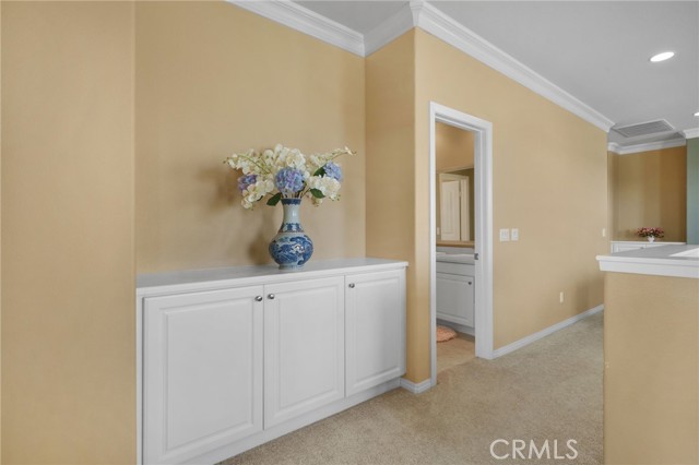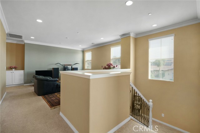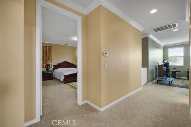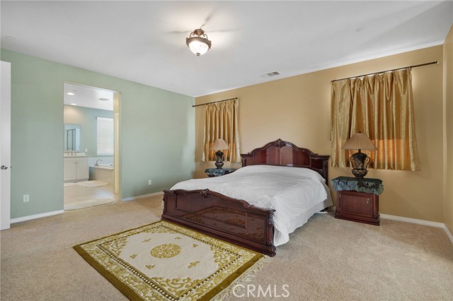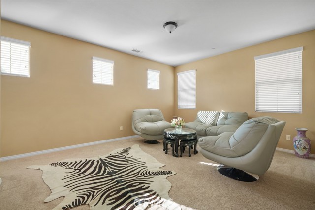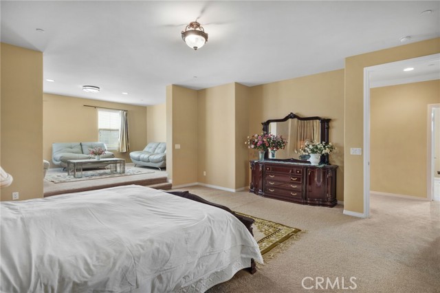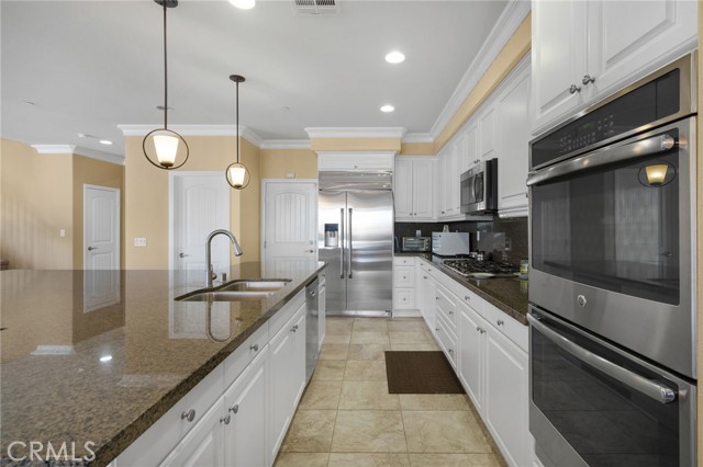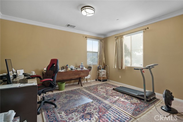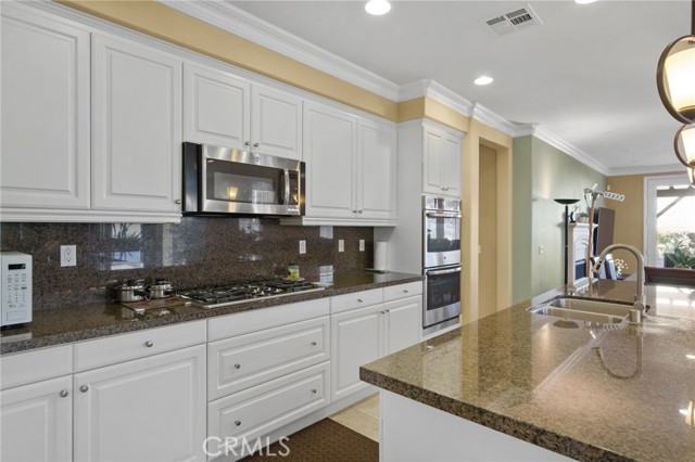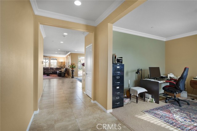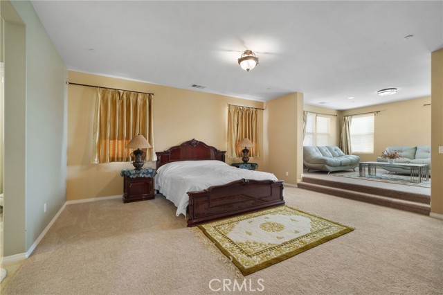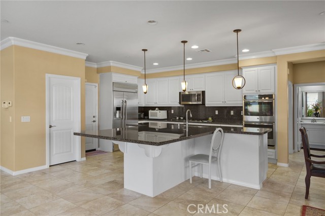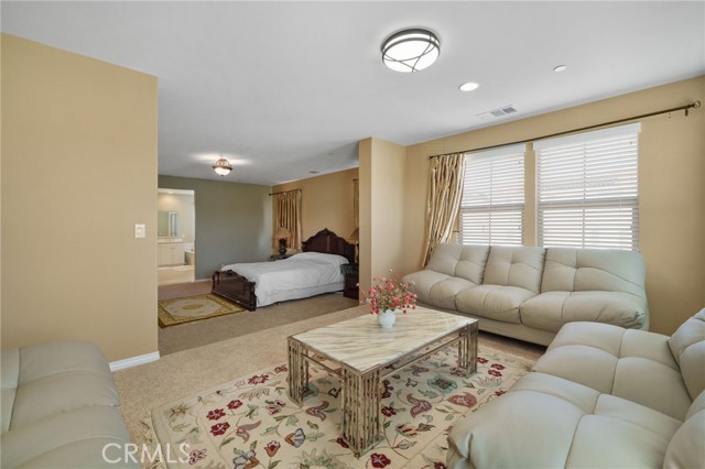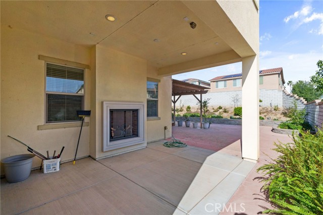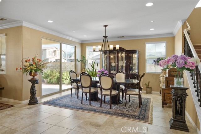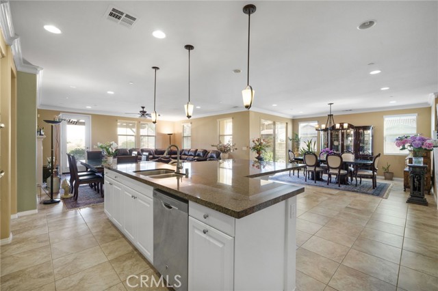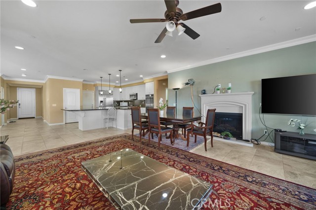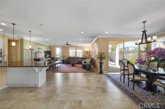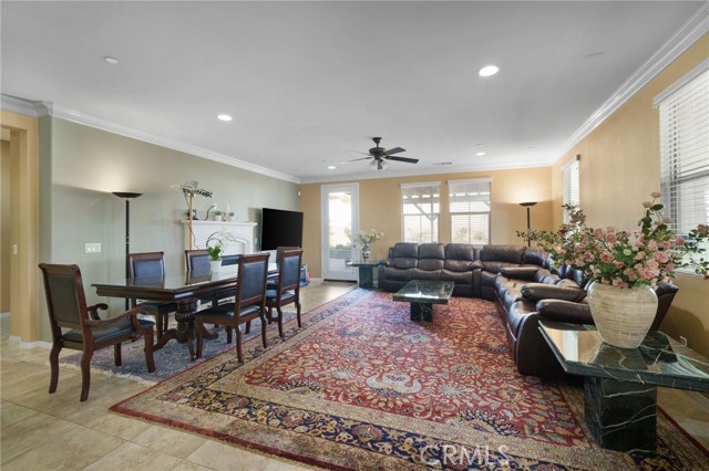 Prime Eastvale Location in the Desirable Estancia Community! Situated on a corner lot, this stunning home offers exceptional curb appeal with lush artificial turf for low-maintenance living. Step inside to a welcoming tile entry that leads to spacious living areas and elegant finishes throughout. The formal living room off the entry can easily serve as a home office or study. A large formal dining room is perfect for entertaining, while the open family room features a cozy fireplace and flows seamlessly into the expansive kitchen. The kitchen is a chef's dream with granite countertops, an extended island with bar seating, a built-in cooktop, and a double oven. This home also features a downstairs potential NextGen suite, complete with its own kitchen, bedroom, and full bathroom — ideal for guests, multigenerational living, or a rental opportunity. Upstairs, enjoy a spacious loft and a luxurious primary suite with a large retreat area, perfect for relaxing. The primary bathroom boasts dual sinks, a walk-in shower, a soaking tub, a vanity area, and a huge walk-in closet. Three additional bedrooms share a full bathroom with dual sinks. The convenient upstairs laundry room includes built-in shelving for extra storage. Additional highlights include most furniture, solar panels, and crown molding throughout. The beautifully landscaped backyard is perfect for entertaining, featuring a covered patio with a built-in fireplace, stamped concrete, and plenty of space to relax or host gatherings.