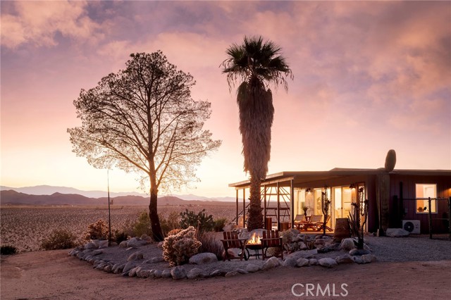 29 WEST PYRAMID HOUSE: Perched on the top of its own mountain, this striking 2-bedroom, 2-bathroom retreat delivers 360-degree views spanning Indian Cove in Joshua Tree National Park, Big Bear, and San Gregorio. Framed by dramatic imported boulders and pristine desert landscape, the property offers a rare blend of privacy, serenity, and natural beauty. At night, the dark skies transform into a stargazer's dream, making this a true High Desert sanctuary. The centerpiece of the landscape is a bold steel-frame pyramid, measuring 24' x 24' x 14', positioned at the mountain's edge. This dramatic outdoor structure creates a visual anchor and an unforgettable backdrop for both day and night desert living. Inside, the home is curated with Venetian plaster walls, lime wash finishes, and custom vertical plaster striping. The open floor plan is framed by expansive sliding glass doors and an 8-foot picture window, pulling the desert scenery directly into the living space. Spa-inspired bathrooms feature floating vanities, backlit mirrors, wood tile, and marble finishes, blending sophistication with soothing desert textures. A shaded porch extends from the living room, offering a peaceful vantage point for sunrise coffee or evenings under the stars. Custom channel lighting in the living room mirrors the sharp lines of the pyramid, emphasizing the interplay of geometry and desert landscape. The large kitchen showcases brand-new counters, custom cabinetry, and generous storage — designed for both everyday use and stylish entertaining. Centrally located at the edge of 29 Palms and Joshua Tree, this property is just minutes from both villages, with easy access to shops, restaurants, and Joshua Tree National Park. Blending bold design, natural elements, and complete privacy, this mountain-top retreat embodies modern desert living at its finest — the kind of home you'd expect to see in the pages of Architectural Digest.