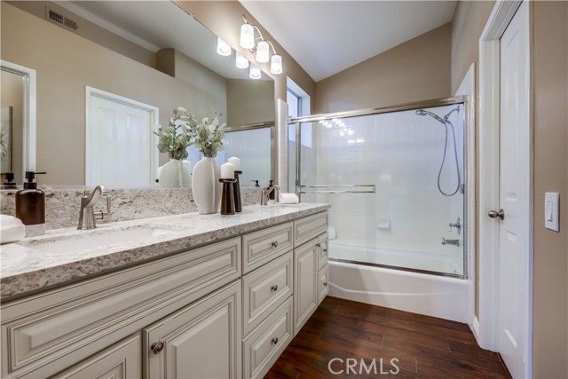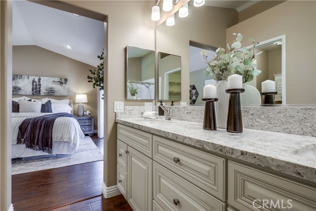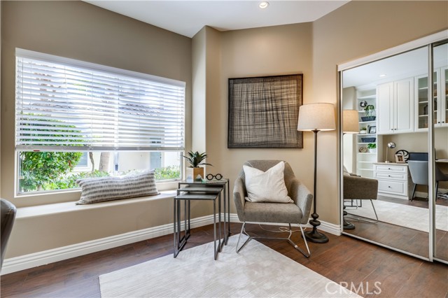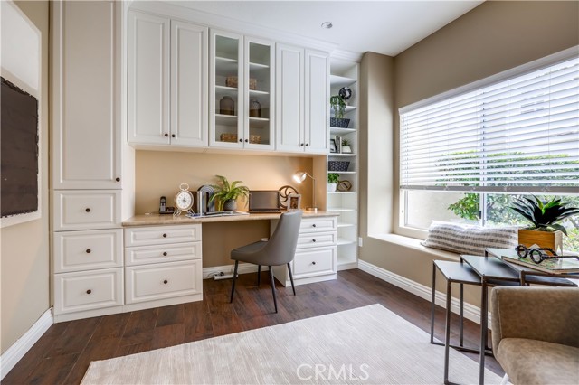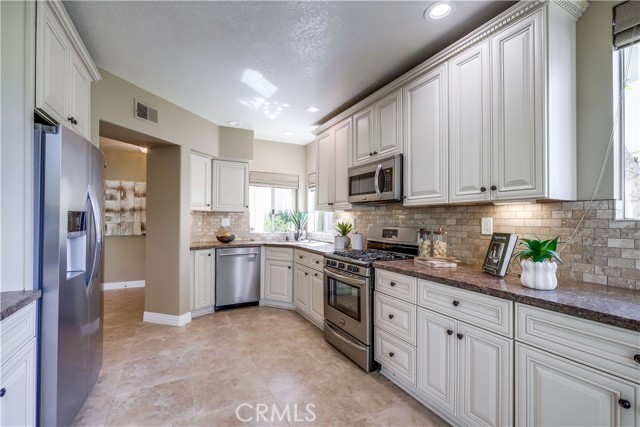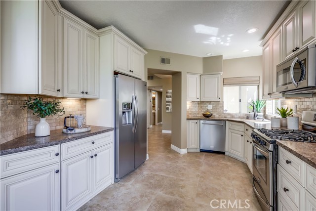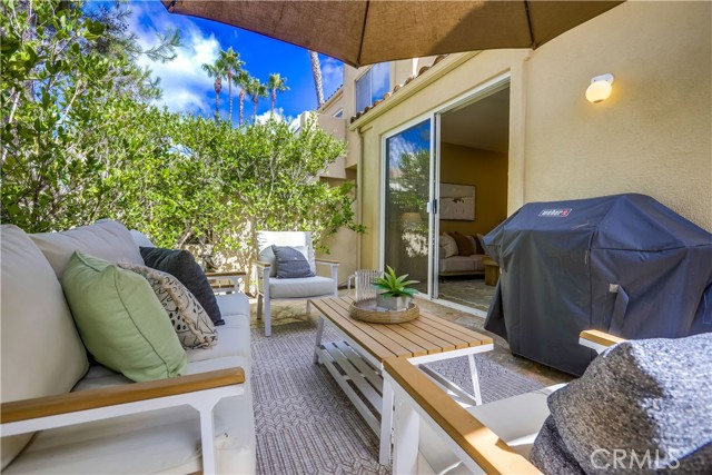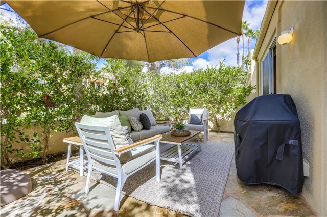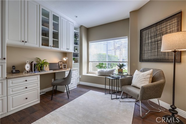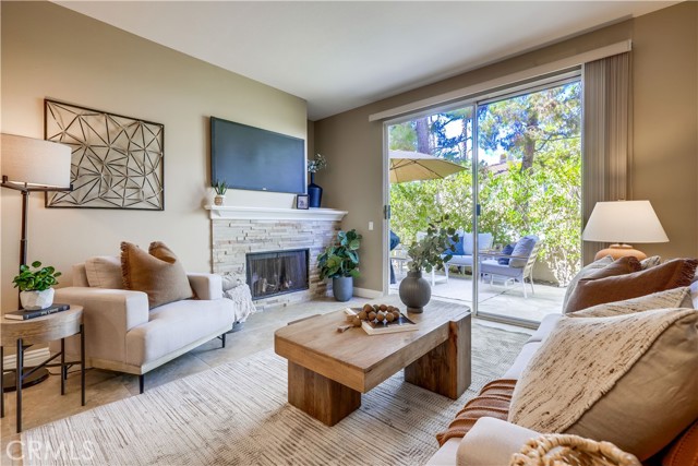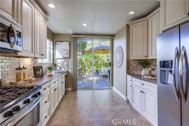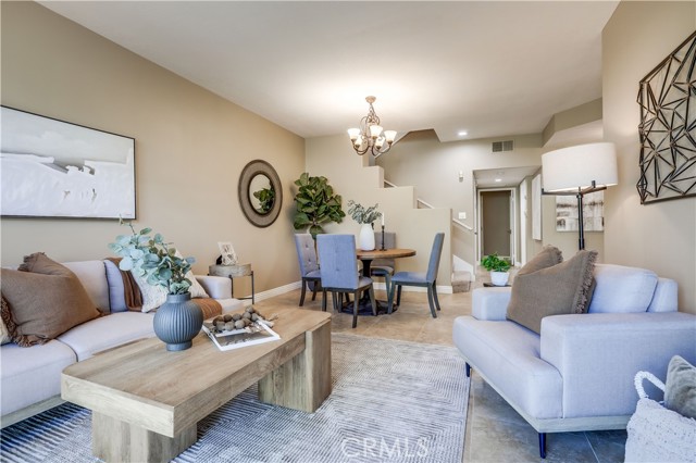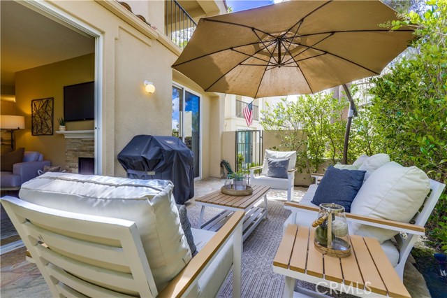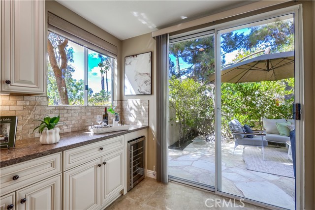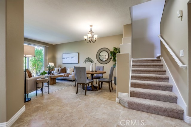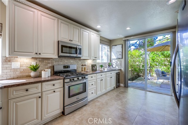Prepare to fall in love with this beautifully updated and well-maintained home superbly located in the highly desirable Encore at Marina Hills community, the perfect example of pride in ownership. You will adore the private location, a superb setting for peaceful living in this friendly Marina Hills community ideally located a short walk from Parc Vista Park and Marina Hills Park. As you enter, the flush mount Crystal chandelier in the entry way sets the tone in this graceful home with Ceramic tile floors throughout the main level, custom lighting, a neutral palette, and a well-designed floorplan. The living room is open to the dining area and has direct access to the backyard patio, creating an ideal indoor-outdoor living space for gatherings with friends and family around the cozy stacked stone living room fireplace. The elegant Kitchen was beautifully remodeled with exquisite cabinetry, soft close doors and drawers, gorgeous Quartz countertops, marble backsplash, built-in wine fridge, recessed lighting, stainless steel appliances including a 2024 KitchenAid dishwasher, undercabinet accent lighting, and direct access to the backyard patio, perfect for entertaining. The main level includes a highly sought-after full bathroom with walk-in shower, and a bedroom with built-in cabinetry and workspace, window seat, and mirrored closet doors, perfect for an executive home office or 3rd bedroom. The newly carpeted stairs lead you up to the dual bedroom suites, each with an ensuite bathroom and laminate floors, including a primary suite with an updated bath with dual Quartz topped vanity, gorgeous cabinetry, upgraded lighting, a large walk-in closet, and a private balcony taking advantage of the cool ocean breezes, and peek-a-boo views towards the coast, an ideal setting for an evening glass of wine with a loved one. The convenient main level laundry room has full size washer and dryer hookups, linen cabinets, and dual light switches. The enclosed backyard is a private oasis perfect for relaxing and BBQing, with sealed flagstone patio, sprinkler and drip system, and gated exterior access. The attached 2 car garage has motion sensor lighting, built-in cabinetry & overhead storage racks. Encore amenities include a sparkling pool & spa, lounging & picnic areas. Community re-piped in 2018. Close to Marina Hills Park pool, clubhouse, tennis courts, playgrounds, sports fields, & sport courts, shopping, dining, hiking & biking trails, and minutes from local beaches.