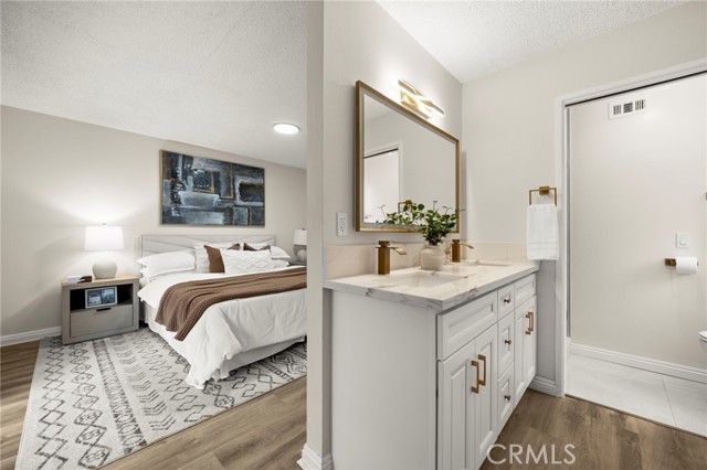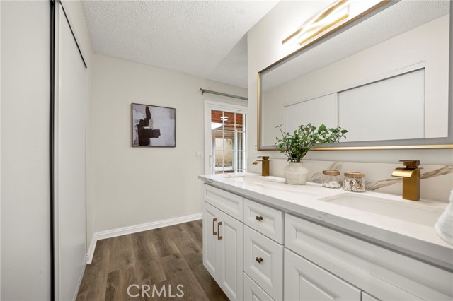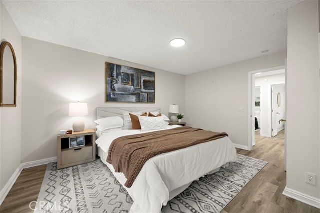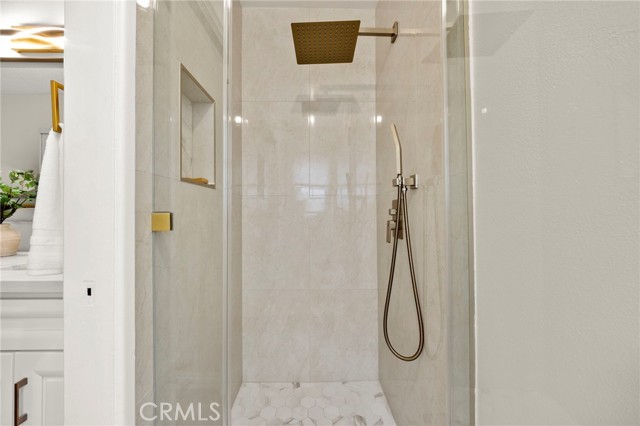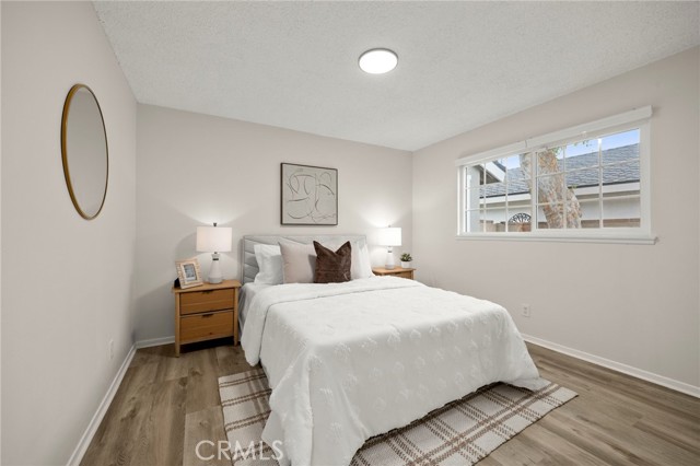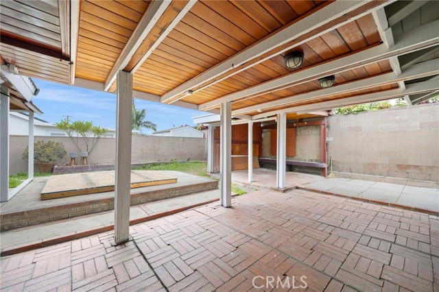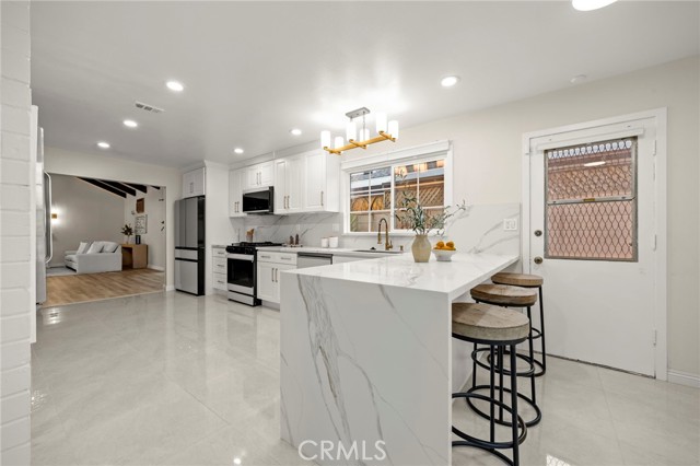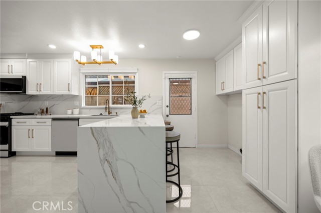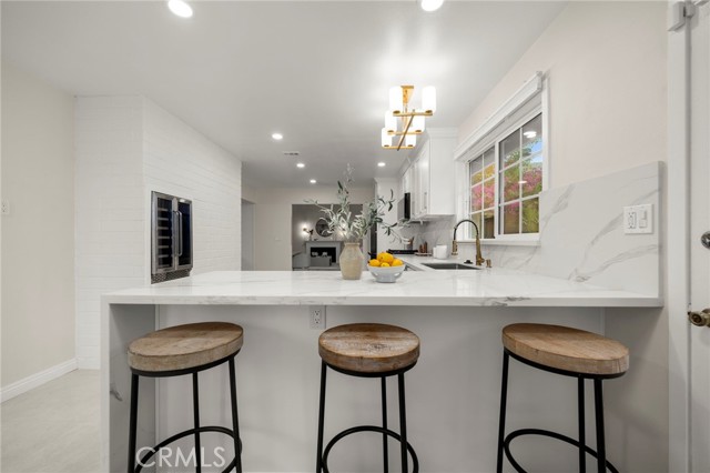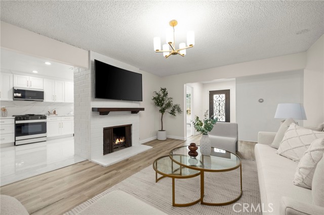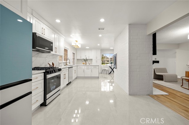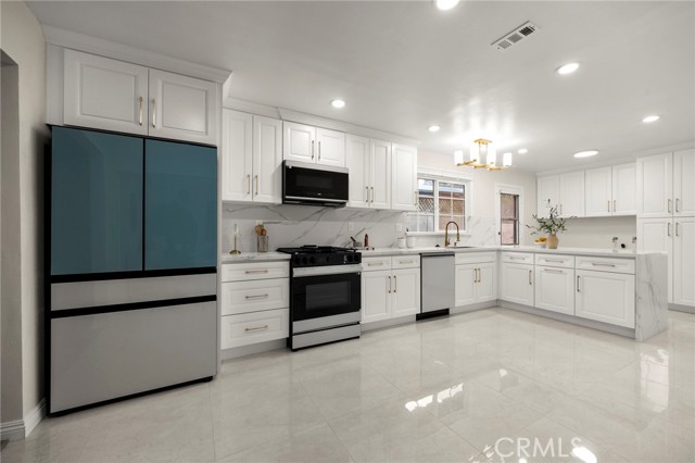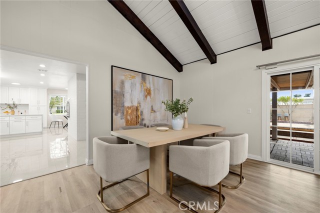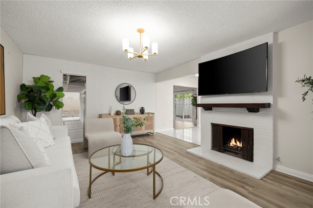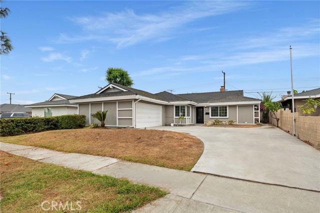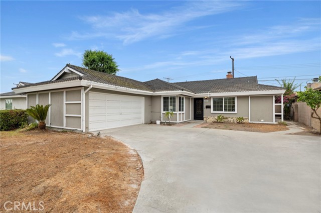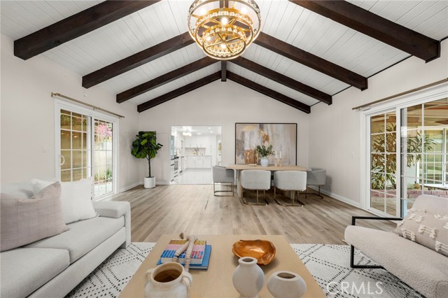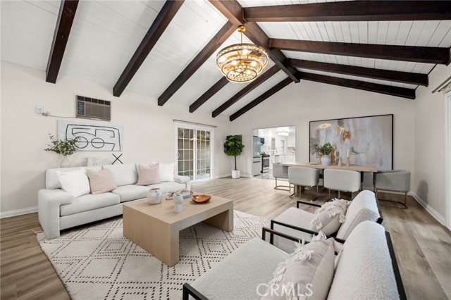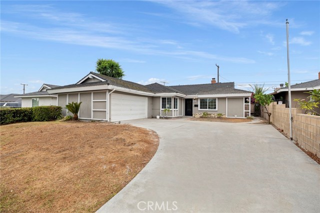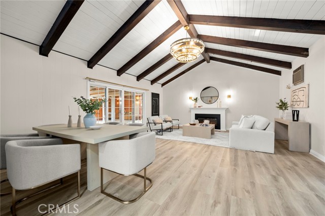 Welcome to this beautifully updated 3-bedroom, 2-bathroom home, nestled in one of La Mirada's most sought-after neighborhoods. Blending classic charm with thoughtful modern upgrades, this home offers both comfort and style in every corner. Step into a freshly remodeled kitchen, featuring sleek porcelain flooring, gorgeous new countertops, and brand-new stainless-steel appliances — including a refrigerator and wine cooler. Natural light pours in through oversized windows, creating a bright and welcoming space that flows seamlessly into the dining area, now enhanced with a dramatic high ceiling and an elegant 42" chandelier. This home boasts multiple spacious living areas, including a cozy family room with an electric fireplace and a vaulted ceiling with striking wood beam accents — perfect for gatherings or quiet evenings in. The primary suite offers a peaceful retreat with direct backyard access and abundant natural light. Both bathrooms have been tastefully upgraded with gold-framed glass shower doors and modern fixtures for a spa-like experience. Enjoy a wide lot, curved driveway, and spacious outdoor areas, ideal for relaxing or entertaining. Don't miss this rare opportunity to own a spacious, updated home in the desirable La Mirada community — perfect for modern living with timeless character.