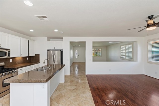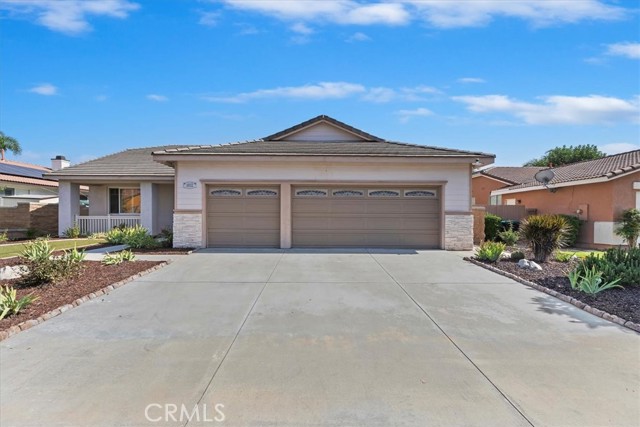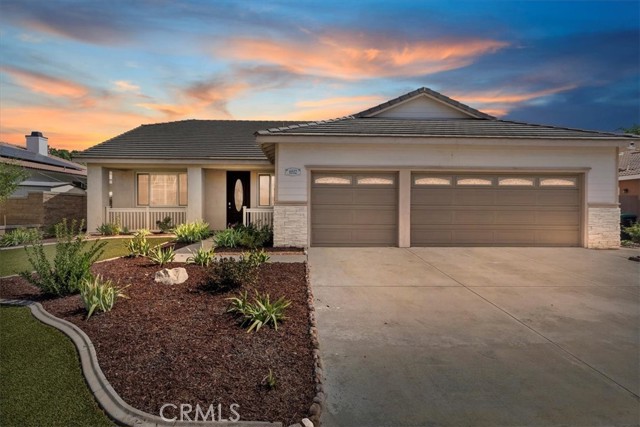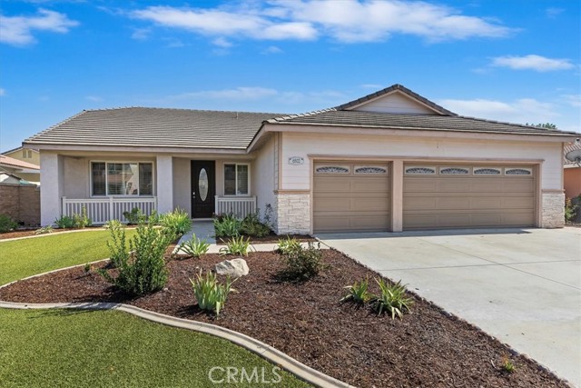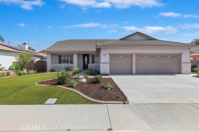 This beautifully maintained single-story home nestled in one of Eastvale's most sought-after neighborhoods features approximately 2,383 square feet of spacious living space on a generous sized lot, combining comfort, functionality, and charm in one inviting package. Step inside to discover a bright, open floor plan designed for both relaxation and entertaining. The formal living and dining areas flow seamlessly into a cozy family room centered around a warm fireplace perfect for the upcoming Winter months. The kitchen features a large island, abundant cabinetry, stainless steel appliances, and ample counter space, ideal for anyone who loves to cook or entertain. The primary suite offers a peaceful retreat with a spacious layout, dual sinks, a soaking tub, walk in shower, and a very spacious walk-in closet. Secondary bedrooms are well-sized and versatile, easily adaptable for home offices or accommodating guests. Outside, enjoy a private landscaped backyard perfect for hosting company, morning coffee, or simply relaxing during a quiet evening. The property also includes a 3-car garage, Turf landscaping that cuts maintenance costs, front porch area, fresh new paint, plantation shutters throughout, tile and laminate wood flooring, and a spacious individual laundry room, adding both convenience and curb appeal. Located near top-rated schools, shopping, and major commuter routes, all combining suburban tranquility with everyday convenience. It's a wonderful opportunity to own a beautifully kept home in the heart of Eastvale. This home is a must see!