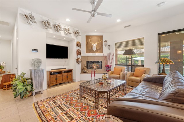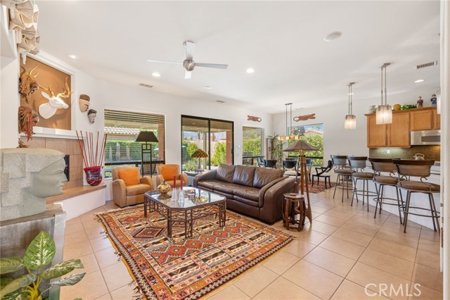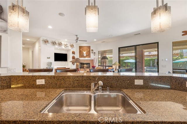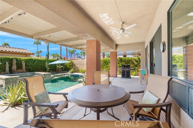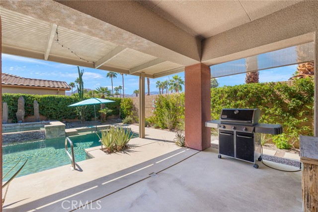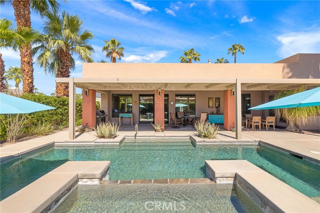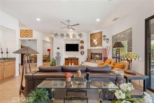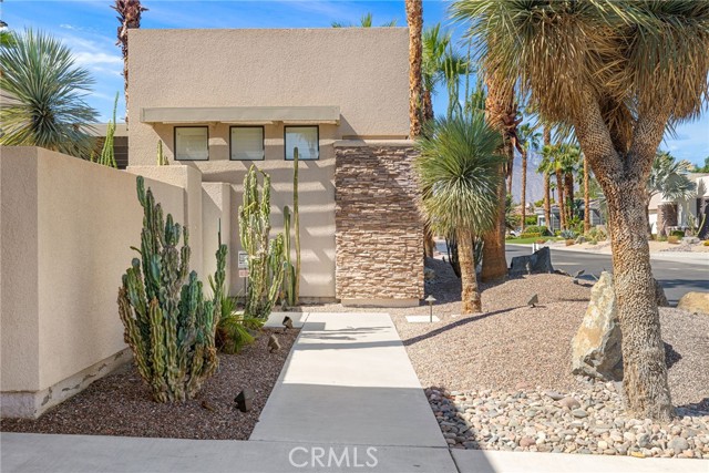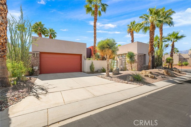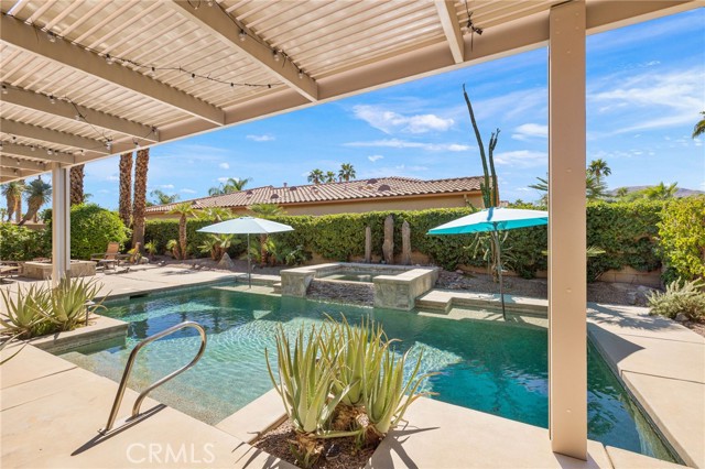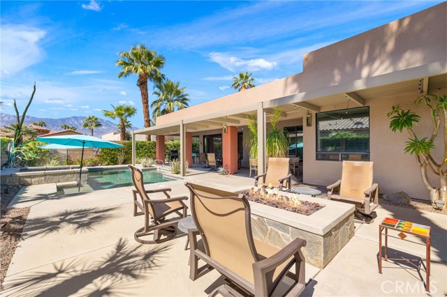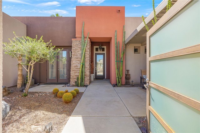 This highly upgraded contemporary home in the desirable Montage community offers resort-style living on an oversized interior corner lot providing a greater sense of openness. Well maintained, with or without certain furnishings, this home features 3 bedrooms, 3.5 bathrooms, a flexible living room or office, and a detached, private guest casita. The open-concept layout flows effortlessly from the chef's kitchen — with slab granite countertops, dual ovens, and a large breakfast-bar into the spacious great room and out to a covered patio overlooking the saltwater pool, spa, fire pit, and another outdoor casita fireplace. The property showcases a beautifully designed and professionally landscaped desert oasis, with mature fig and lemon trees, and a variety of stunning palms and cacti gracing both the front and rear yards, creating a lush, private retreat. Additional highlights include a total of three fireplaces, speaker system throughout, and low-maintenance desert landscaping. Energy efficiency abounds with a Lennix top-of-the-line duel HVAC systems and a Vivint Solar lease for low monthly utility costs. Montage residents enjoy a complimentary Social and Fitness Membership to Mission Hills Country Club included in the low $340 monthly HOA fee. Ideally located just minutes from golf, dining, and Palm Springs nightlife, this home blends luxury, comfort, and efficiency in one perfect desert escape.