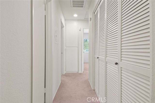 Rare complex corner unit! Welcome to a beautifully maintained townhome tucked away in a peaceful Newhall community. This corner unit sits in a prime rear location, offering added privacy, elevated neighborhood views, and a tranquil atmosphere Inside enjoy an open floor plan designed for comfort and easy living. The spacious living room features elegant tile flooring, crown molding, and a cozy two-sided fireplace, perfect for relaxing evenings or entertaining guests. The dining area includes a ceiling fan and flows naturally into the kitchen, which offers plenty of counter and cabinet space, a walk-in pantry, tile flooring, and a full set of appliances including a stove, microwave, and dishwasher. Upstairs, the primary bedroom stands out with vaulted ceilings, generous space, and a private full bath. Two additional bedrooms and a hall bath provide flexibility for work, rest, or guests. You'll also appreciate the convenient upstairs laundry closet with built-in storage. Enjoy thoughtful touches like linen cabinets, a downstairs powder room, and a two-car garage. The home's corner placement enhances natural light and creates a wonderful sense of openness. This residence is ideally located near freeway access, shopping, and dining, making everyday living both easy and convenient. Whether relaxing by the fireplace, hosting friends, or taking in the view from your windows, this home offers the space and features you'll love to come home to.