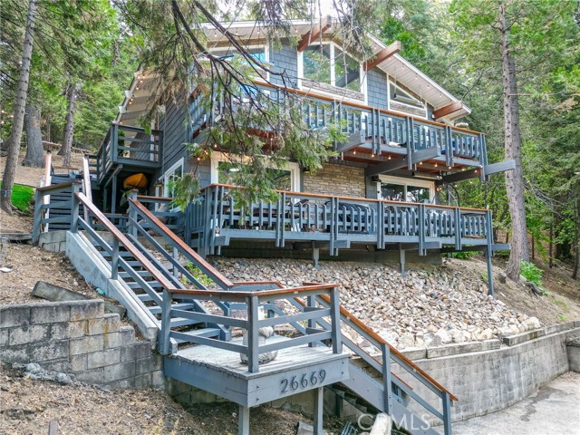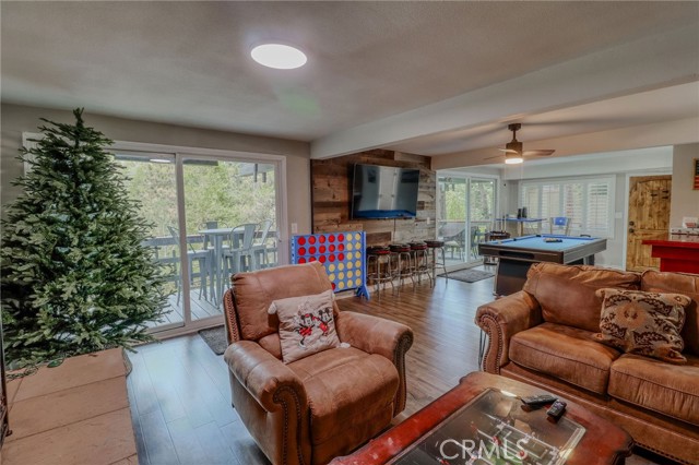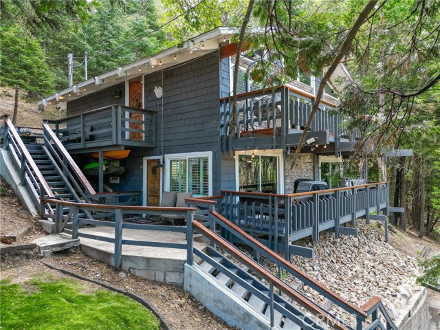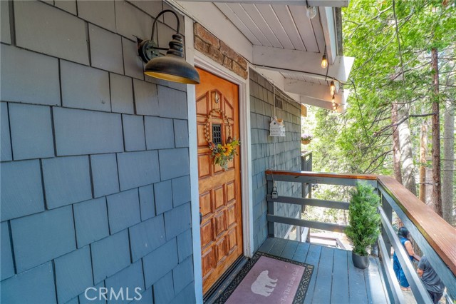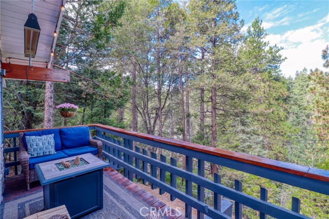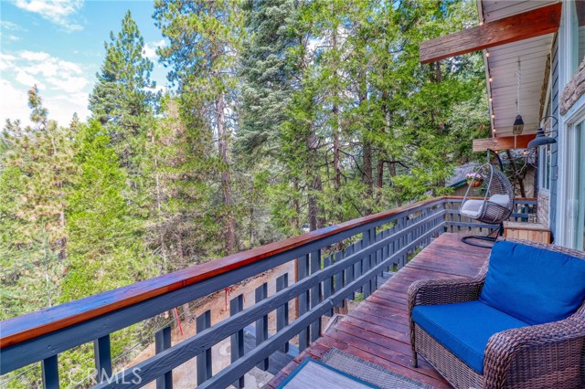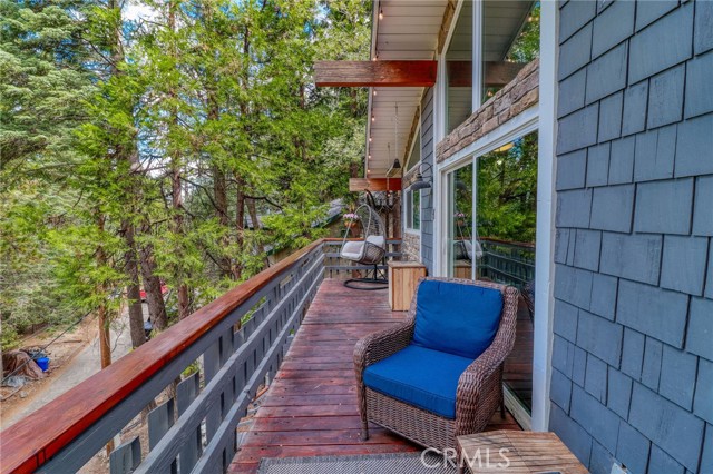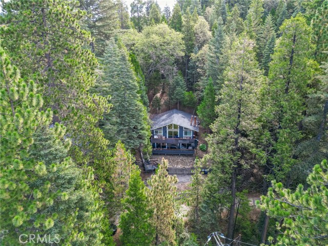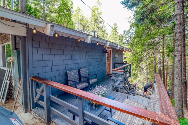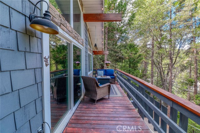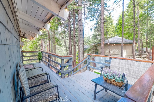 Looking for the perfect mountain getaway, full-time home, or short-term rental? This could be it! Welcome to this FURNISHED newly renovated, refined yet cozy chalet in beautiful Twin Peaks. The home features an open floor plan with vaulted, open-beamed ceilings connecting the living, dining, and kitchen areas. The living room offers a wood-burning stove accented by a stunning stone wall, floor-to-ceiling tinted windows with picturesque treetop views of the evergreens, and a small loft nook ideal for reading or play. The beautifully remodeled kitchen includes quartz countertops, stainless steel appliances, and a built-in microwave. Downstairs, the spacious family/game room features a refaced gas fireplace with ceramic logs, a wood accent wall, and access to a deck perfect for entertaining. The first bedroom offers built-in twin bunk beds, ceiling fan, and sliding door access, while the second bedroom features newer carpet with memory foam padding and a charming loft nook ideal for a play space or extra sleeping area. The upstairs bathroom includes a tub and shower with gorgeous Travertine flooring and tiled shower wall, while the downstairs bathroom features a shower, laundry area, and shiplap ceiling and wall accents. Enjoy the outdoors on any of the three decks, relax on the backyard swing overlooking the forest, or soak in the above-ground spa under the beautiful starry mountain nights. Additional features include plantation shutters, dual-pane windows, central A/C and heat, a tankless water heater, and a newer roof, all replaced within the past three years. With plenty of windows to capture mountain and forest views and close proximity to Lake Arrowhead Village, Lake Gregory, Blue Jay, Santa's Village, and local ski resorts, this family-friendly home offers the best of mountain living with easy access off the mountain and all the conveniences nearby.