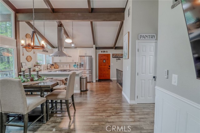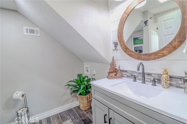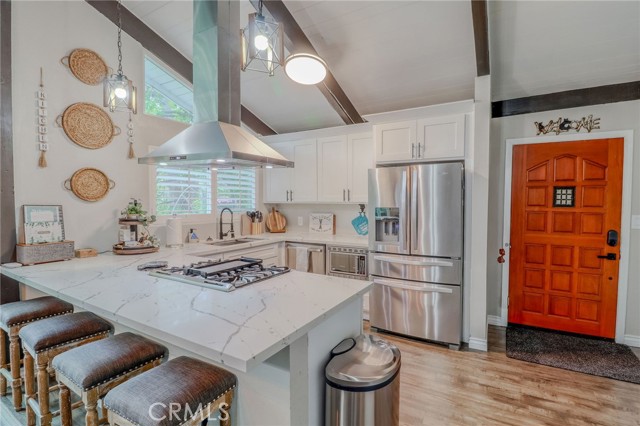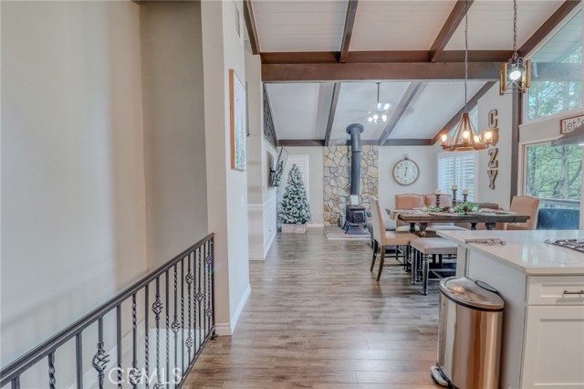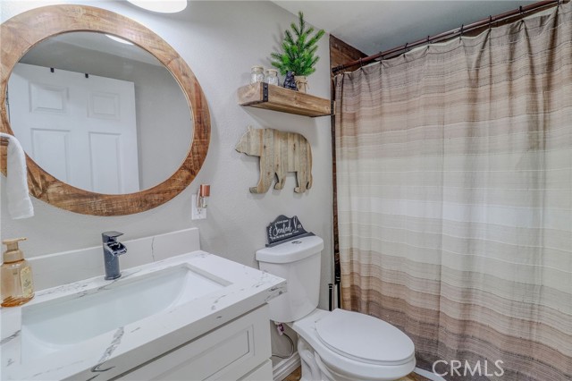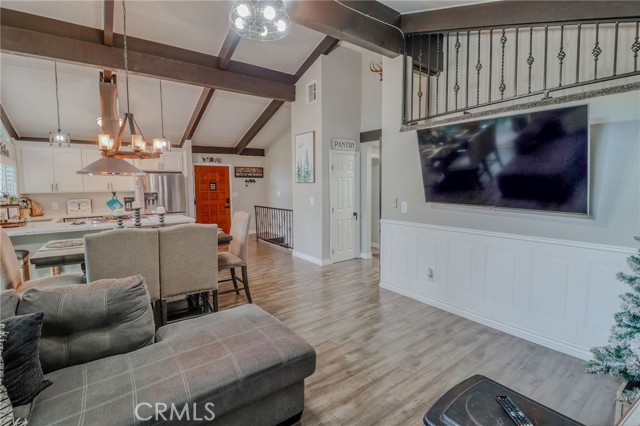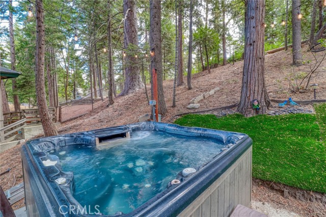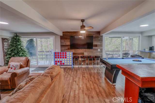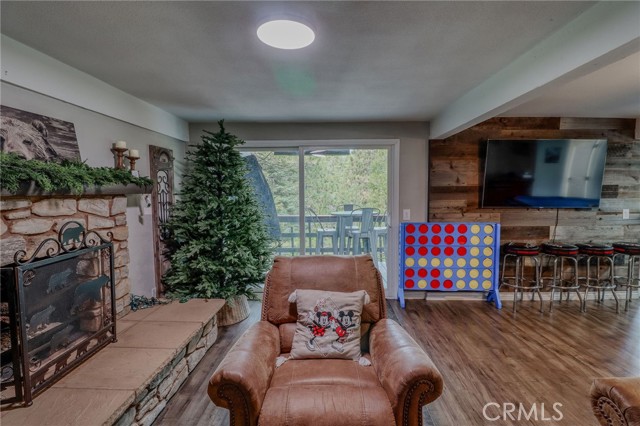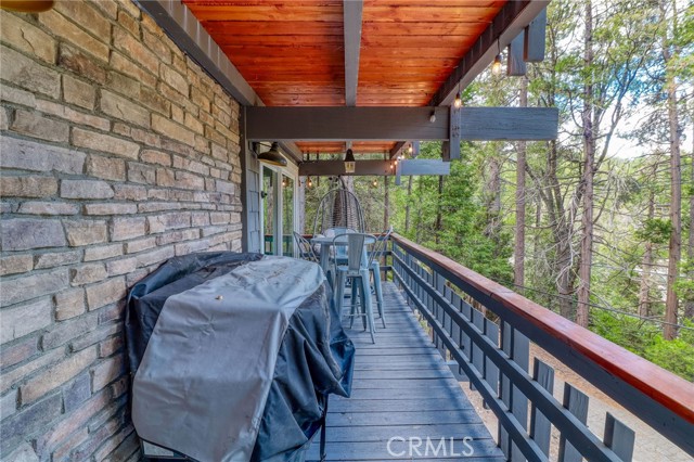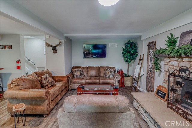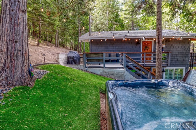 Looking for the perfect mountain getaway, full-time home, or short-term rental? This could be it! Welcome to this FURNISHED newly renovated, refined yet cozy chalet in beautiful Twin Peaks. The home features an open floor plan with vaulted, open-beamed ceilings connecting the living, dining, and kitchen areas. The living room offers a wood-burning stove accented by a stunning stone wall, floor-to-ceiling tinted windows with picturesque treetop views of the evergreens, and a small loft nook ideal for reading or play. The beautifully remodeled kitchen includes quartz countertops, stainless steel appliances, and a built-in microwave. Downstairs, the spacious family/game room features a refaced gas fireplace with ceramic logs, a wood accent wall, and access to a deck perfect for entertaining. The first bedroom offers built-in twin bunk beds, ceiling fan, and sliding door access, while the second bedroom features newer carpet with memory foam padding and a charming loft nook ideal for a play space or extra sleeping area. The upstairs bathroom includes a tub and shower with gorgeous Travertine flooring and tiled shower wall, while the downstairs bathroom features a shower, laundry area, and shiplap ceiling and wall accents. Enjoy the outdoors on any of the three decks, relax on the backyard swing overlooking the forest, or soak in the above-ground spa under the beautiful starry mountain nights. Additional features include plantation shutters, dual-pane windows, central A/C and heat, a tankless water heater, and a newer roof, all replaced within the past three years. With plenty of windows to capture mountain and forest views and close proximity to Lake Arrowhead Village, Lake Gregory, Blue Jay, Santa's Village, and local ski resorts, this family-friendly home offers the best of mountain living with easy access off the mountain and all the conveniences nearby.