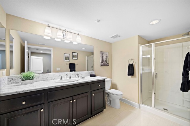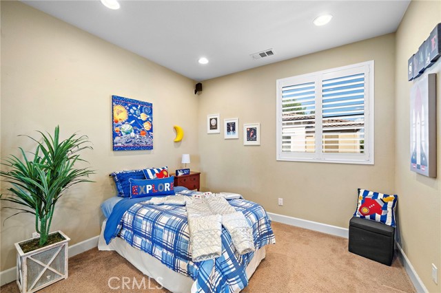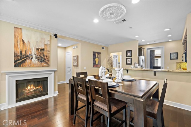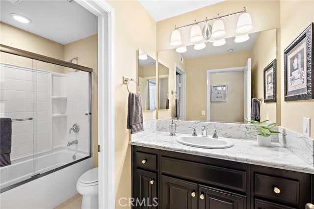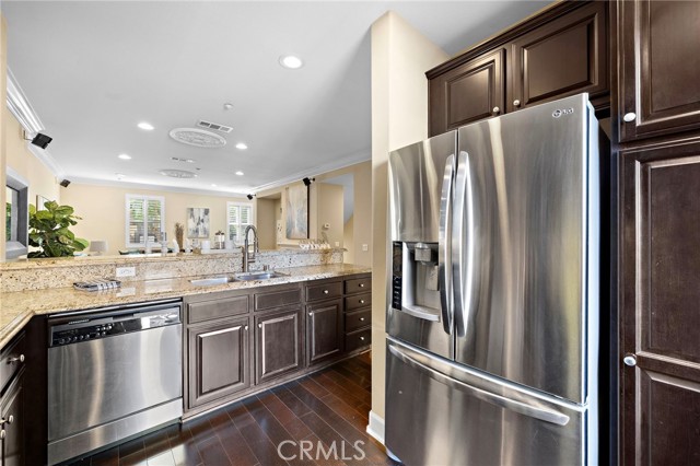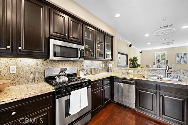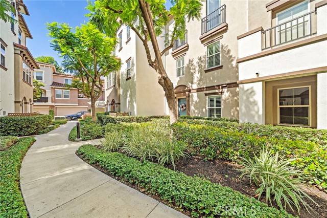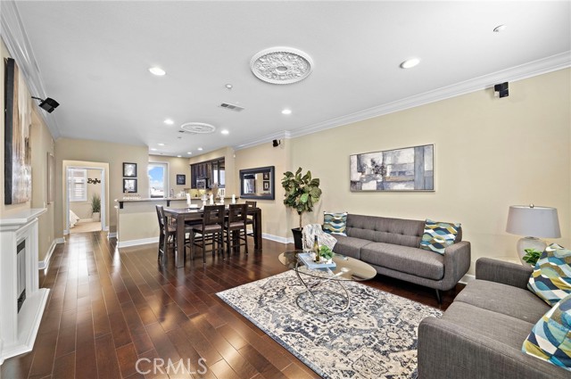 Absolutely stunning tri-level townhome-style condo quality-built by Taylor Woodrow in 2007, nestled in the exclusive Palazzo community within Renaissance Plaza with resort-style association pool, spa, and beautifully landscaped grounds, this contemporary beauty boasts 4 bedrooms, 4 full bathrooms, and 1,814 square feet and has been beautifully upgraded with modern luxury finishes throughout including central A/C, volume ceilings, crown molding, dual pane windows, plantation shutters, clear-glass French doors, raised panel interior doors and closet doors, LED recessed lighting, wide-plank wood laminate flooring, and full surround-sound wiring; the remodeled chef's dream kitchen is a masterpiece with granite countertops, full granite backsplash, rich dark-wood soft-closing cabinetry with glass display panels and under-cabinet lighting, stainless double sinks, and stainless appliances including a gas range, dishwasher, and microwave, plus a breakfast bar open to the elegant living room with fireplace, media niche, and dining area, with a French door leading to a private second-level patio perfect for evening barbeques and dining; the bathrooms showcase Carrera marble-look countertops, upgraded lighting, tile finishes, and clear-glass enclosures, with dual sinks in the primary suite, while an ensuite bedroom on the first floor, inside laundry room, and direct-access 2-car garage plus an additional guest parking provide comfort and convenience; ideally located in the vibrant heart of Stanton, close to shopping, dining, parks, and schools with quick access to the 5, 22, and 91 freeways, offering the perfect combination of modern living, convenience, and effortless accessibility.