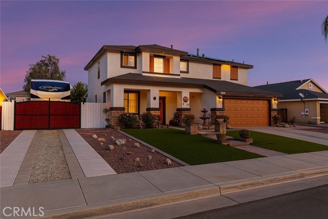 Welcome to a home designed for gatherings and good times! From the moment you enter, the living spaces flow easily to the backyard, creating a seamless indoor/outdoor experience ideal for weekend barbecues, game days, and celebrations. The rear yard features an outdoor bar area perfect for serving drinks and appetizers, plus a dedicated dog kennel to keep four-legged family members comfortable and secure. Need space for your toys? Enjoy true RV parking with power and water hook-ups (no sewer) — bring the trailer, boat, or coach. The home also includes solar panels to help keep your energy bills low while you live comfortably year-round. Thoughtful touches, low-maintenance landscaping, and ample patio space make entertaining effortless. The home itself features all of the bedrooms upstairs with an en-suite featuring a separate shower/tub. The upstairs landing has plenty of room for a space to relax and unwind. Convenient Hemet location close to everyday essentials and area amenities. This one checks the boxes for lifestyle, efficiency, and fun — come see why this home was made for entertaining!