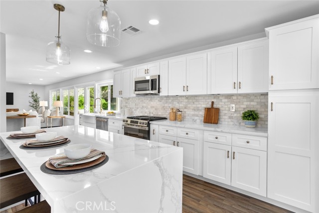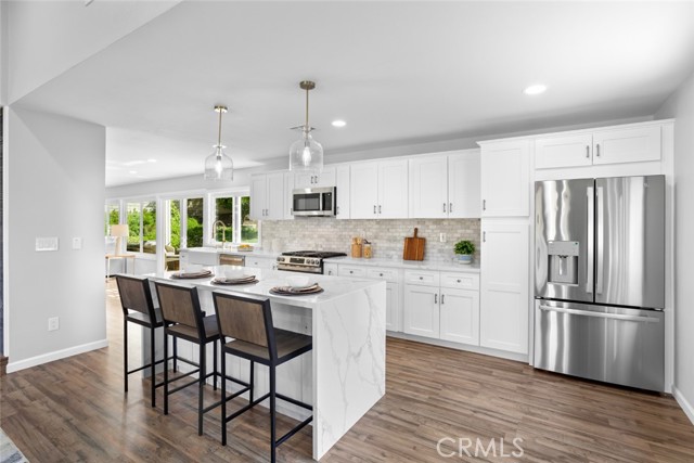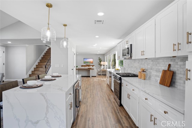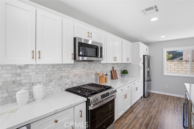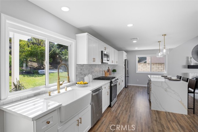 DON'T MISS OUT on this recently updated and spacious TURNKEY home located in a quiet cul-de-sac in one of the most coveted neighborhoods of La Habra! To start off, this home boasts 4 bedrooms and 3 bathrooms including a large master suite with its own luxurious master bathroom and walk-in closet! Throughout the home you'll find LED recess lighting, premium water-proof laminate flooring, a stunning open-concept kitchen containing high-end quartz countertops, a center island with a waterfall finish, a farmhouse sink overlooking the backyard and white shaker cabinets with self-closing drawers! Also, along with the remodeled kitchen there will be a full high-end stainless steel appliance package and wine fridge included! Then, there is a wet bar containing high-end quartz countertops, a sink and white shaker cabinets right next to the cozy living area making the entire space perfect for entertaining days/nights! For the exterior, the front yard contains an attractive curb appeal and a walkway that leads to the inviting front entry while the spacious backyard contains a patio area and freshly laid sod making the entire yard a great space for future family gatherings! In addition, this home offers high efficiency dual-pane vinyl windows throughout and central air/heating! To top it all off, this home is conveniently located within walking distance of multiple shopping centers, such as the Imperial Promenade and the La Habra Market Place, and within minutes of the Westridge Golf Club, Brea Mall and Downtown Brea which both contain beloved restaurants, shops, entertainment and more!