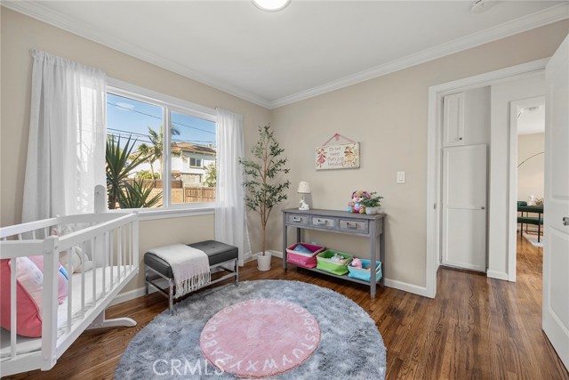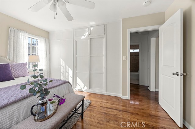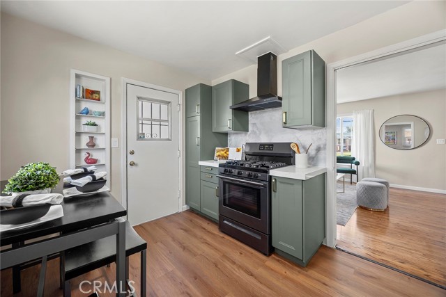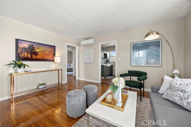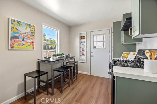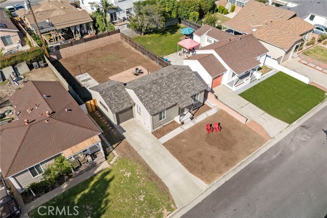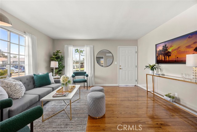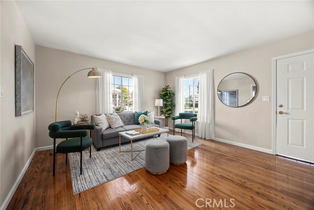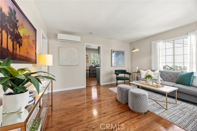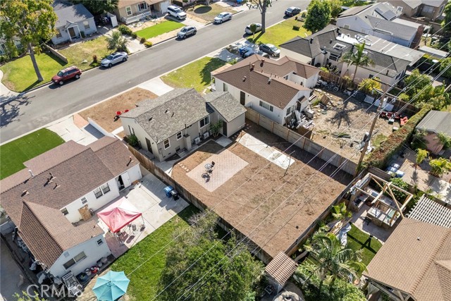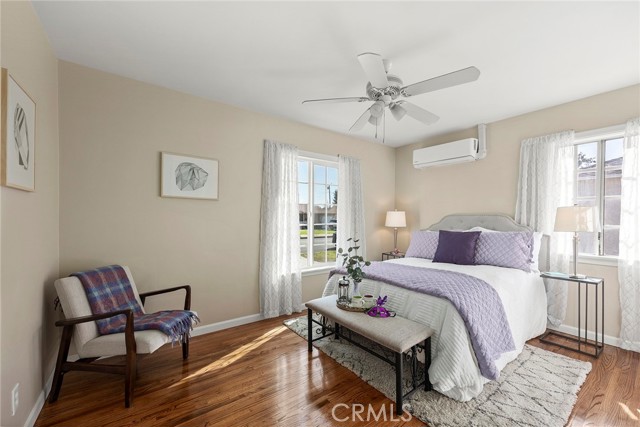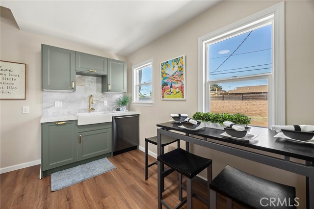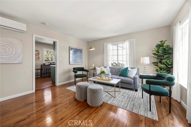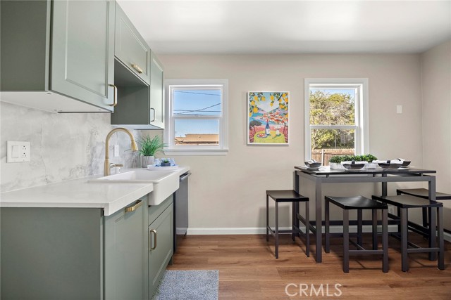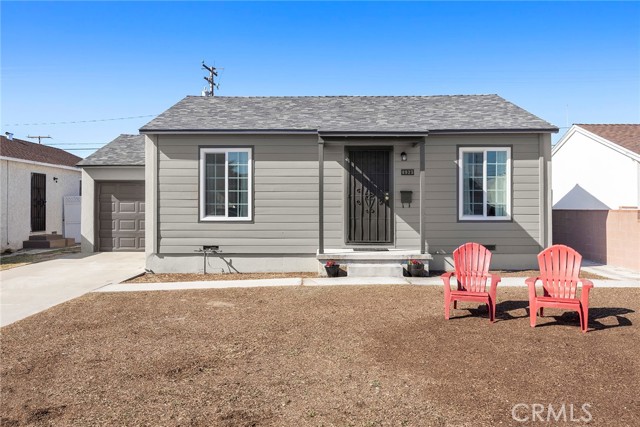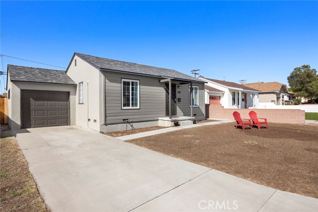 Remodeled to perfection, this stylish and charming post war bungalow is sure to impress with its quality updates throughout, gleaming original hardwood floors, NEW ROOF, many NEW WINDOWS, NEW interior and exterior paint along with a fully remodeled kitchen and upgraded bathroom. A welcoming front porch greets you and leads you inside to a light filled interior. The living room is an inviting space with new baseboards and its own mini-split heating and air conditioner, the original hardwood floors are a showstopper. Continuing on the kitchen has been fully remodeled with new flooring, stylish dark green cabinetry, with pantry and trash/recycle pull out. Satin gold accents include the door pulls and the sink faucet, that is highlighted by the timeless farmhouse sink. Brand new appliances include dishwasher, 5 burner gas range and a black vent hood. Quartz counters and a porcelain tile backsplash are further upgrades, the cozy dining area completes the kitchen. A side door leads to the back porch and out to the backyard with a large paver patio, old fashion clothes line and a blank slate space to build an ADU, add to the existing home or create your dream backyard. Two bedrooms, each with their own mini-split ac/heating units are found off the hallway, both with the amazing refinished hardwood flooring, ample closet space and the rear bedroom has direct garage access. An upgraded and sparkling bathroom awaits with new vanity and fixtures and a tile bathtub surround. Direct access through one of the bedrooms leads to the garage, fully drywalled and just re-painted, laundry connections are in the garage along with extra storage cabinetry.