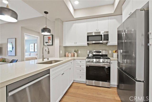 La Sevilla is a brand-new collection of upscale single-level condominiums in the prestigious Rolling Hills Estates, seamlessly combining comfort, simplicity, and modern design. Plan C features an open concept living and dining area that flows effortlessly onto a private balcony, creating a perfect blend of indoor relaxation and outdoor enjoyment. The home showcases elegant finishes, including wide-plank hardwood flooring throughout, quartz countertops, a full tile backsplash, and a premium stainless-steel appliance package with a French-door refrigerator, built-in microwave, gas range with AirFry, and dishwasher. The spacious primary suite includes a luxurious bathroom with a glass-enclosed shower, quartz counters, designer porcelain tile, and stylish stainless-steel accents. Residents have access to a grand courtyard with inviting sitting areas and a dual fireplace, as well as a modern fitness center, remote-work lounge, community room, and a barbecue area with a firepit — ideal for gatherings and leisure. Situated on the scenic Palos Verdes Peninsula, La Sevilla offers the tranquility of a high-end neighborhood combined with exceptional walkability. Just steps away are Peninsula Center shops, the public library, grocery stores, coffee shops, and a variety of local restaurants. Additionally, the community is minutes from scenic hiking trails and the stunning beaches of Palos Verdes, making it easy to enjoy outdoor adventures and coastal beauty.