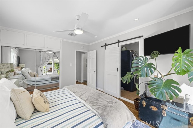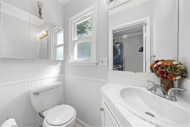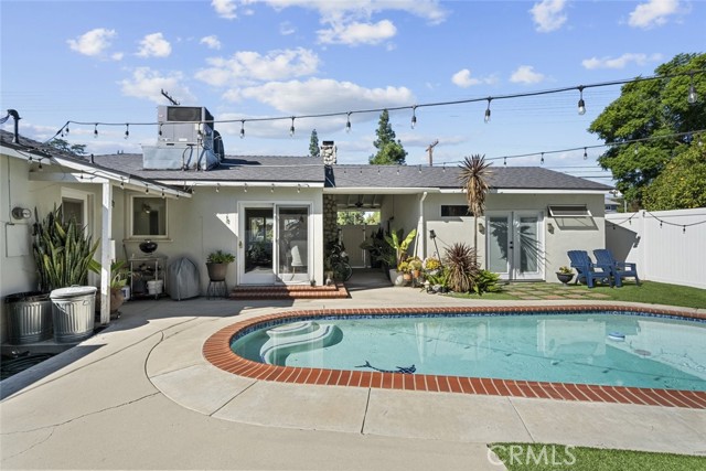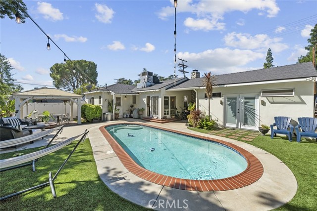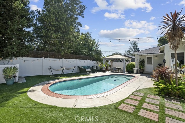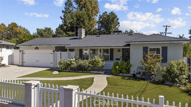 Granada Hills Pool Home! Welcome to this beautifully maintained 2-bedroom, 1.5-bath home offering 1,038 sq. ft. of living space on a generous 5,870 sq. ft. lot. From the moment you arrive, the inviting curb appeal, white picket fence, paved driveway, and manicured front yard set the tone for what awaits inside. Inside, you'll find an open floor plan filled with natural light, highlighted by recessed lighting, ceiling fans, and rich wood flooring throughout. The cozy living room features a stunning rock-accented fireplace, creating a warm and welcoming atmosphere. The kitchen boasts stainless steel appliances, a designated dining area, and double sliding doors that open to the backyard — perfect for seamless indoor-outdoor living. The primary bedroom includes mirrored closet doors and a stylish en-suite bathroom with dual sinks and a shower/tub combo. A convenient laundry room with stackable washer and dryer adds everyday practicality. Outside, enjoy your own private retreat. Take a dip in the sparkling pool, relax under the gazebo, or entertain friends and family in the spacious backyard. The 2-car garage has been thoughtfully converted into a man cave, offering a great bonus space for lounging, hobbies, or entertainment. With tasteful white interior paint throughout, this home perfectly blends comfort, style, and functionality. Must see to appreciate. Located within close distance to Granada Hills Charter High School, a large and highly regarded public charter school in the Granada Hills neighborhood.