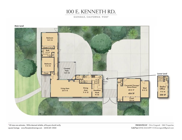 Charming middle-century single-story Traditional on a spacious corner lot at the top of Brand Blvd on the border of Rossmoyne and Northwest Glendale. The functional L-shaped floorplan features two wings. The western wing has a generous open floor plan Living/Dining Room space that has amazing large windows that let in lots of natural light and is anchored by an original stone fireplace with mahogany mantle and built in bookshelf. Also at this end of the house are the restored vintage Kitchen that has recently refinished solid wood cabinets, an eat-in nook and newer stainless appliances as well as the home's Laundry Room, access to the back patio and the second Bathroom, this one with a stall shower. The east wing contains both of the home's Bedrooms which are separated by the main full Bathroom. The main level of the house opens to the spacious back patio through four different doors, creating a fabulous CA indoor/outdoor lifestyle. Below the Kitchen and entered through a door off the driveway is an add'l 200 SF Studio/Office/Gym with a half Bathroom. The home's 2-car Garage was converted to 454 SF bonus living space by a previous owner and also has a half Bathroom. There is Central HVAC (except in the converted Garage), copper plumbing, mostly ABS waste lines, 125 AMP electrical panel, water tight roof, and original seismic bolting. A large asphalt pad offers plenty of off-street parking and a handy shed offers additional storage. Close to the charming shops and dining along North Brand Blvd including Trader Joes, Starbucks, religious services, Equinox gym as well as quick access to the 2, 5 and 134 Fwys.