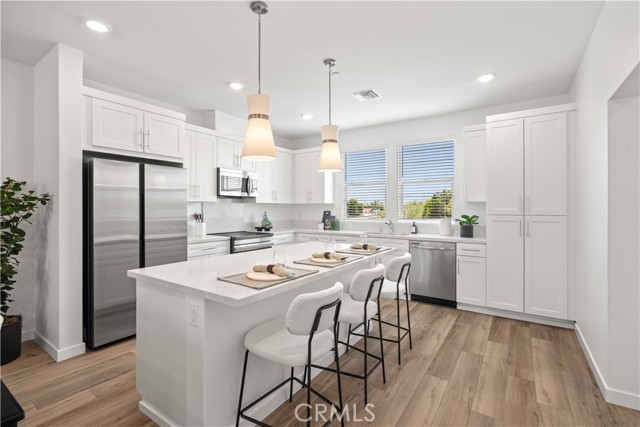 Welcome to your new home in Azul, a gated community by KB Home in Pico Rivera. This stylish Plan 1560 townhome offers 1,560 sq. ft. of modern living across three levels, featuring 3 bedrooms, 2.5 bathrooms, and a thoughtfully designed open floor plan perfect for both comfort and convenience. The main level showcases a bright open-concept layout with a spacious kitchen at the heart of the home. Enjoy quartz countertops, white Shaker-style cabinetry, chrome finishes, and Samsung stainless steel appliances including a smart induction range and Energy Star® dishwasher. The large kitchen island provides extra prep space and casual seating, seamlessly connecting to the great room, ideal for entertaining or everyday living. Upstairs, the primary suite offers a private retreat with a walk-in closet and spa-inspired bathroom featuring dual sinks, quartz counters, and a glass-enclosed shower. Two additional bedrooms with mirrored wardrobes share a full bathroom. A convenient powder room on the main level makes hosting guests easy. Throughout the home, you'll find durable vinyl plank flooring, extending even into the bedrooms and stairways for a cohesive and low-maintenance design. Smart and energy-efficient features include an ecobee3 Lite smart thermostat, Energy Star® lighting, upstairs laundry with 220V outlet, and TV prewiring in the great room. Located in the heart of Pico Rivera, Azul offers convenient access to Whittier Narrows, Turnbull Canyon, and Arroyo Pescadero Trailhead for outdoor recreation. Commuters will appreciate the quick connections to Hwy. 164, Hwy. 60, I-605, and I-5, with downtown Los Angeles only 30 minutes away. Nearby shopping, dining, and local favorites like Alchemy Craft and Brewjeria Company make this location the perfect blend of comfort and convenience. Don't miss this opportunity to own a modern, move-in ready townhome in Pico Rivera's Azul community by KB Hom.