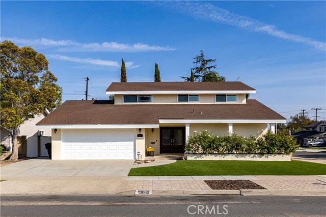 Timeless elegance meets modern comfort. This beautifully updated two-story home on a sunny corner lot offers stunning curb appeal, refined interiors, and effortless flow. Step through double glass doors into bright, open living spaces featuring central air conditioning, crown molding, rich hardwood floors, and a cozy stone fireplace. The remodeled kitchen boasts shaker cabinetry, quartz-style counters, stainless appliances, and connects seamlessly to the dining room with French doors leading to a private backyard retreat. Upstairs, serene bedrooms and remodeled bathrooms with refinished hardwood floors and dual pane windows and more smooth ceilings await. Located inner tract and walking distance to the large Bolsa Chica City Park with all it's amenities and the award winning Eastwood Elementary School this home is located in a neighborhood known for being the best kept secret in Orange County.