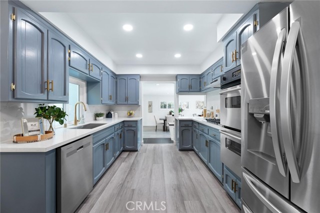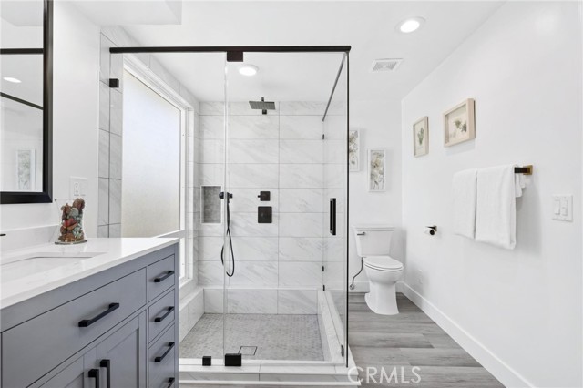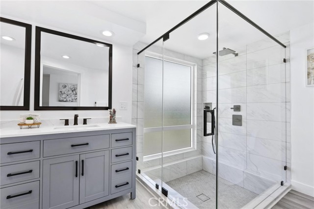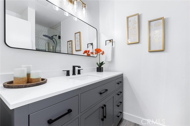 RARE FIND - Remodeled and Move-In Ready Northridge Two Story! This stunning residence offers the perfect blend of modern elegance and convenient living with 2 primary bedrooms – one on the main level and one on upper – perfect for multi-generational / extended family living. Boasting a comfortable and flexible 5 bedroom layout with a convertible den that can effortlessly be transformed into a 5th bedroom, along with 4.5 stunning bathrooms, boasting both comfort and style. This home has undergone a comprehensive renovation, leaving no detail overlooked. From the striking kitchen and baths, designer luxury vinyl plank flooring to the upgraded fixtures throughout, every inch of the property exudes a fresh and modern aesthetic. The thoughtfully designed floor plan is bathed in natural light, creating an inviting atmosphere throughout. An elegant living room is the perfect place to unwind by the cozy fireplace, creating a warm and inviting ambiance for gatherings with family and friends and offers a sliding glass door with views to the rear yard. The heart of the home, the kitchen is a chef's dream come true, featuring stunning quartz countertops, an abundance of cabinet space, quality stainless steel appliances and a breakfast area, the kitchen is as functional as it is stylish. Continue on into the step-down dining area and family room that providing ample space for relaxation and entertainment with wet bar, ½ bath for guest and another sliding glass door that creates that great indoor / outdoor feel. Upstairs you will find the expansive main primary suite with a walk-in closet, a cozy sitting area and a gorgeous private en suite bathroom, complete with dual sinks, modern fixtures and custom tiled shower. Secondary bedrooms are all on the main level and offer great space and functionality. Additional upgrades include fresh paint inside & out, central air & heat, 2 water heaters, upgraded dual-pane windows (2 are still original diamond pane for aesthetic), and completely finished attached 2 car garage. Outside, the relaxing rear yard features a spacious patio with new above ground spa, perfect for relaxing or al fresco dining year-round. Beautiful low maintenance landscaping with automatic drip irrigation system, keyless entry, and Indoor laundry room, are just some of the many highlights in this amazing home. See it today.