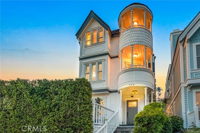 This Extraordinary custom-built beach home is located two blocks from the sand, in one of Huntington Beach's most desirable coastal neighborhoods. This home stands out for its exceptional craftsmanship, timeless architectural details, and thoughtful design that blends coastal charm with upscale living. From the moment you arrive, the home impresses with its Victorian-inspired turret facade, wrap-around balconies, and picture-perfect curb appeal. Inside, every room showcases artisan-level detail, including coffered ceilings, rich wood flooring, custom millwork, and beautifully integrated built-ins. The heart of the home is the expansive chef's kitchen, featuring a large island with Calcutta gold quartz, bar seating for five, custom cabinetry, a vintage-inspired range, and open shelving. The kitchen flows seamlessly into the light-filled family room, highlighted by intricate ceiling panels and French doors that open to the courtyard. Multiple entertaining spaces, both upstairs and downstairs, make this home ideal for gatherings. The welcoming formal living and dining rooms offer warm millwork, wainscoting, and cozy sitting areas, including a charming elevated lounge framed by columns and a brick alcove. Upstairs, the spacious primary suite is an oasis of comfort with its own private balcony, a sitting area, and plenty of natural light. The spa-inspired primary bathroom features a claw-foot soaking tub, a walk-in shower, and elegant finishes. Additional bedrooms are well-appointed, with custom wall treatments and coastal decor. The upstairs also includes a home office, complete with built-ins, and access to another balcony with ocean breezes. This home offers unique, high-value amenities rarely found this close to the beach, including: A full media/theater room with tiered leather seating and a massive 125-inch screen, A rooftop deck with hot tub, panoramic sunset views, and space for lounging or dining, Multiple balconies with neighborhood and palm-tree-lined sightlines, A private courtyard patio perfect for morning coffee or evening relaxation. This home is in the boundaries of Agnes L Smith Elementary, Ethel Dwyer Middle, and Huntington High — all highly rated schools. Enjoy the oceanfront bike path, Pacific City, Huntington Beach Farmers Market, and Surf City Nights. The pier and popular off-leash dog beach are within walking distance. Your dogs can enjoy the sand and the surf while you relax.