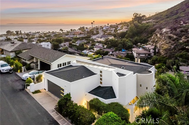A stunning example of contemporary Laguna Beach architecture with panoramic views of the Pacific Ocean and the city below. This highly updated home spans approximately 4,256 square feet across four levels and features five bedrooms in addition to multiple outdoor spaces. The living space, dining area, and kitchen flow seamlessly to create a large, voluminous great room just off the main entryway. Multiple windows perfectly frame the ocean views and let in abundant light. The recently renovated kitchen features two-tone cabinetry, a suite of Bosch appliances, and a waterfall-edge marble island with a cooktop. A large patio off the living area allows for alfresco dining, while the fireplace with a modern concrete mantle anchors this airy space. The primary suite spans the entire top floor, with walls of Pacific-facing windows, a sizable balcony, and a massive walk-in closet. The remodeled owners' bathroom is grand and features a standalone tub, a seamless dual shower, and floating vanities. Another of the home's fireplaces rounds off this floor. All secondary bedrooms are located on lower levels, granting their occupants ultimate privacy. A junior suite with an adjacent five-piece bath and walk-in closet shares the floor with another of the home's decks and two additional bedrooms connected by a jack-and-jill bathroom. The lowest level houses a large flex space with its own entrance, which lives like an ADU - with a kitchenette and a full bath. Dream location, with Laguna's shopping, galleries, and famed beaches just minutes away.