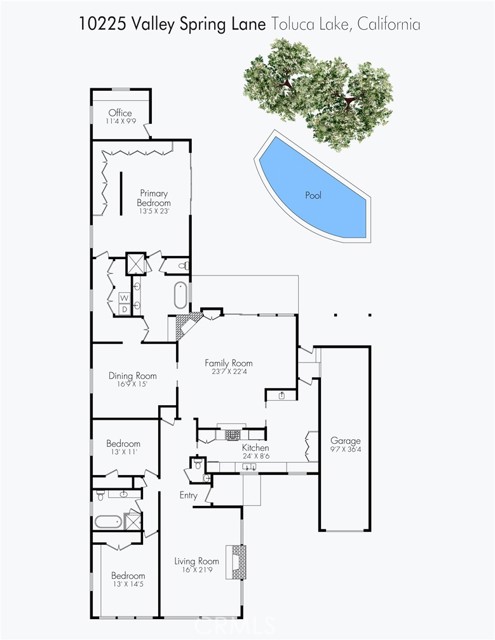 Set on an oversized 14,715 sq ft lot across from the historic grounds of Lakeside Golf Club, this single-story Traditional sits on one of the most sought-after streets in the San Fernando Valley, long valued for its privacy, scale, and quiet sense of prestige. The home unfolds through a series of generous, light-filled rooms that prioritize flow, comfort, and separation of space. Vaulted, wood-beamed ceilings and multiple fireplaces lend warmth and scale to the main living areas, while French doors throughout reinforce a seamless relationship between interior rooms and the outdoors. The layout allows for both gathering and retreat, with a distinct primary suite positioned separately from the secondary living spaces, offering privacy and a calm sense of removal. The kitchen has been designed with longevity and functionality in mind, featuring a Miele dishwasher, a Sub-Zero refrigerator, Bosch double ovens, a built-in coffee station, and a breakfast nook complemented by a wet bar and beverage refrigerator. Bathrooms have been updated with stone surfaces and pedestal tubs, maintaining a restrained material palette that respects the home's original character while providing modern comfort. Outside is where the property truly comes to life. Mature trees, refreshed landscaping, and winding garden paths create a private, park-like setting, anchored by a recently updated heated pool that's ideal for everyday use or entertaining. A separate office or gym with its own entrance adds flexibility for work or creative space, and a two-car attached garage provides everyday convenience. With its oversized lot, private outdoor oasis, and it's position along Valley Spring Lane, the property presents an opportunity to enjoy immediately while also offering meaningful potential for future expansion or reimagining — allowing a new steward to build upon a timeless setting in one of Toluca Lake's most enduring residential pockets.