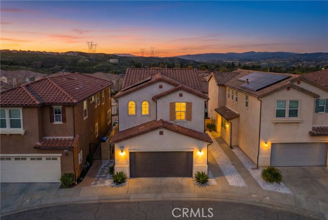 Take in breathtaking valley views and enjoy the savings of owned solar with NO Mello Roos at 19849 Via Ott in Santa Clarita. This spacious 3-bedroom + loft, 2.5-bath two-story home is tucked into the foothills within a gated community and offers a bright, open layout designed for everyday comfort and effortless entertaining. Downstairs features laminate wood flooring, a generous great room with dining, and a stunning center island kitchen with breakfast bar, stainless steel appliances, large sink, and a walk-in pantry — all oriented to capture the backyard and views. Step outside to a private retreat with mature landscaping, paver patio, and side yard turf — framed by block and wrought iron fencing. Upstairs, an oversized loft anchors the bedrooms, plus a perfectly placed upstairs laundry room with loads of cabinets/storage. The expansive primary suite is a true sanctuary with room for a sitting area, office, or workout space — highlighted by an incredible view. The primary bath offers dual sinks, a soaking tub, separate shower, and a large walk-in closet. Two oversized secondary bedrooms with ceiling fans share a full bath. Additional upgrades include Nest thermostat, doorbell camera, smart watering system, and motorized window blinds. Approximately 2,125 sq ft, attached 2-car garage, and a location close to shopping, dining, and commuter routes — this home is the has it all and more!