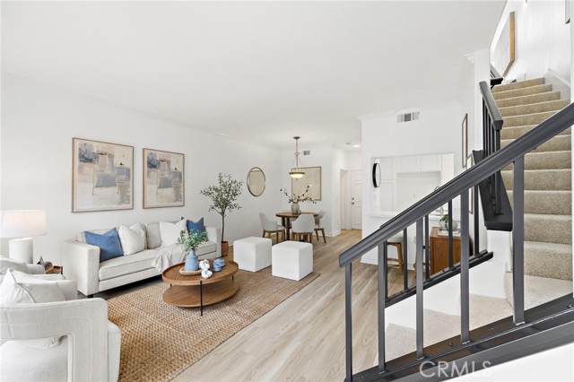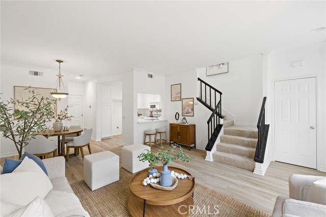 Welcome to 15 Windchime, located in the sought-after South Orange County community of Aliso Viejo. This remodeled 2 beds and 3 baths in GATED Aliso Viejo community. Enjoy this completely REMODLED, 1291-square-foot home, with updated interior which includes all new interior paint, both full bathrooms remodeled with designer tiles, kitchen remodeled with quartz countertops, fresh paint on cabinets, wide plank tan luxury vinyl flooring, and new tan carpeting. This is a popular layout with a large patio/gate entryway, into a spacious living room with oversized windows. Dining room and kitchen open to living and dining room. Powder room is half bath on first level, and attached two car garage with laundry in garage area. Upstairs has an added BONUS ROOM with fireplace and mantel for additional living area, office, along with attached second Patio. the Primary bedroom is open and bright with sliding closet, large windows and area for a workspace or retreat. The secondary bedroom and private bath with a step-in tub and single sink. This tract has easy parking, pool, spa, sport courts, playground, scenic biking trails, easy access to freeways, close to beach areas. Exceptional shopping and entertainment within a mile, and close to many great venues. Windsong is one of the nicest locations in and around the Aliso Viejo area.
