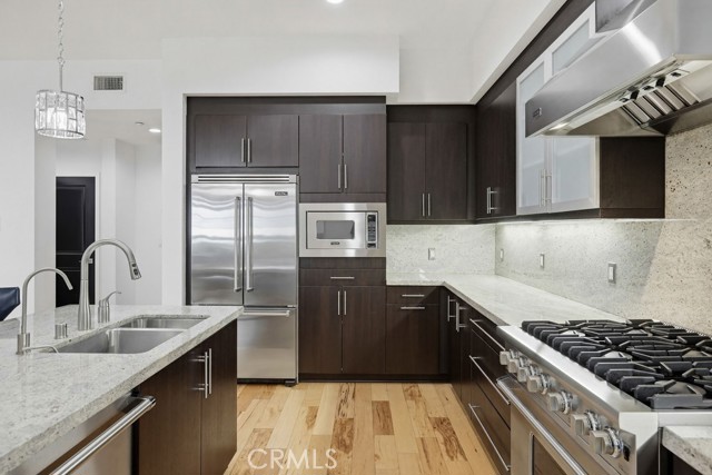 This exceptional Lennox penthouse represents the pinnacle of luxury living, offering ultimate privacy and views. Encompassing approximately 2,066 square feet, the residence showcases refined design and an opulent level of finish throughout. The open and airy floor plan is thoughtfully designed to maximize sweeping views of the city skyline. Expansive windows flood the interiors with natural light, creating an inviting and sophisticated living environment. Interior features include designer lighting, upgraded window treatments, high-volume ceilings, recessed lighting, custom harwood flooring and a private terrace ideal for outdoor relaxation and entertaining. The immaculate layout offers two spacious en-suite bedrooms, the primary suite is a serene retreat featuring a luxurious en-suite bathroom with a spa-inspired custom walk-in shower, soaking tub, modern fixtures and a large custom walk-in closet. The state-of-the-art kitchen is a chef's dream, complete with a center island, white cashmere granite countertops, full backsplash, sleek modern cabinetry and premium stainless steel Viking appliances. Additional highlights include a rare oversized, private, side-by-side two-car garage with custom cabinetry. Residents enjoy access to Central Park West world-class amenities, including two resort-style pools, a luxurious clubhouse, state-of-the-art fitness center, yoga studio, outdoor spas, multipurpose room, lounge with bar and fireplace, catering kitchen, outdoor barbecue areas, and an expansive entertaining terrace with a grand fireplace. The community also features a pickleball court, half basketball court, tot lot, beautifully landscaped paseos, and mini parks. Building amenities include lobby concierge service, indoor and outdoor hallways, a grand lobby, and a newly remodeled courtyard completing this unparalleled elevated lifestyle. Experience Irvine Financial Districts world-class culinary scene and explore an array of retail options, whether you prefer a leisurely stroll through boutique shops or enjoying a delightful meal at a nearby restaurant. The Lennox presents an unparalleled opportunity to embrace a sophisticated lifestyle in one of Irvine's most sought-after locations, with easy access to Fashion Island Newport Beach, UCI, John Wayne Airport, and the beautiful beaches of Orange County.