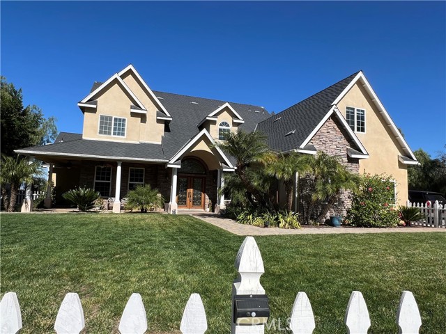 BRING YOUR FAMILY, HORSES AND PETS TO THIS CUSTOM BUILT LAKE VIEW HOME. This 4 bedroom, 3 ½ bath home with a library/formal dining, office/bedroom and large game room sits on a fully useable 1.9 AC lot. Leaded glass front doors and 20 ft ceilings welcome you to the entry which is open to the living room where double French doors introduce the beautiful lake view. A library/dining room is to the left of the entry with a decorative wrought iron stairway to the right. The large kitchen is equipped with KitchenAid appliances including a built-in refrigerator, double convection oven and 6 burner stove. There's an oversized island with seating for four and nice breakfast area. All the lower cabinets and the pantry have roll-out shelving. A small walk-in pantry is around the corner. The kitchen is open to a sizeable family room with fireplace. A relaxing primary suite is located on the first floor along with the office/bedroom, laundry room and guest bath. The Primary suite has a lake view, access to two patios through French doors and the spa like bath has a jetted tub, individual vanities, frameless shower and two walk in closets. There is a junior suite with en-suite bathroom and walk-in closet upstairs. Both North facing upstairs bedrooms have beautiful lake views and French doors that lead to the large upstairs deck with fireplace where you can take in the peaceful vistas of the lake, mountains, hills and trees. The large bonus room has built in cabinets, mini fridge, plumbing for a sink and lots of space for crafting and more. The home is appointed with engineered hard wood, travertine and tile flooring, and high-end lighting fixtures in the entry and living area. There are ceiling fans in every bedroom, family room and game room. Two new Quiet Cool whole house fans help keep the home cool and the electric bill down. The home has three AC units and WIFI connected thermostats. Out side you'll find multiple covered and uncovered patio areas, a BBQ island with sink, a firepit, landscaping front and back, automatic double swing entry gate at driveway, fully fenced perimeter of three rail white PVC fencing and additional fencing around landscaped areas. The covered patios have ceiling fans. This almost 2AC property is zoned for horses and some agriculture. Home has propane and septic system. Lots of room for an ADU. Enjoy the peace and beauty of this area but have every convenience 10-15 minutes away. Agent is owner.