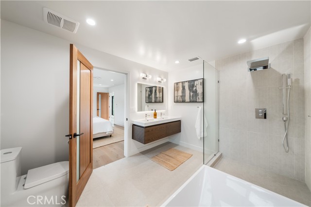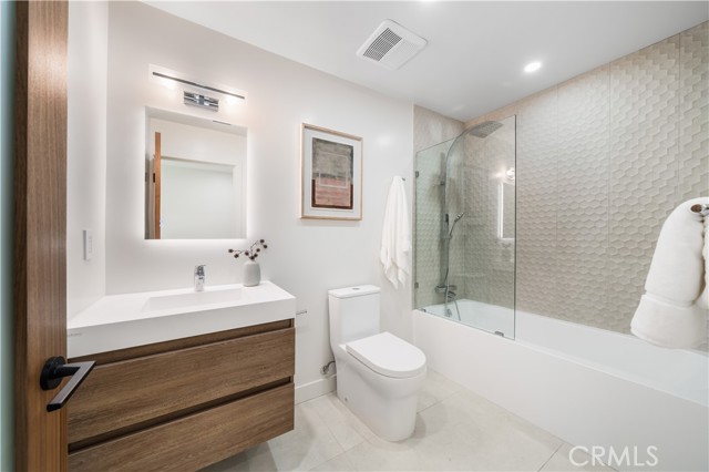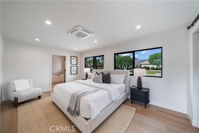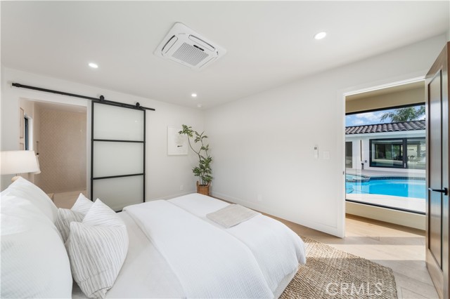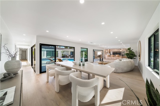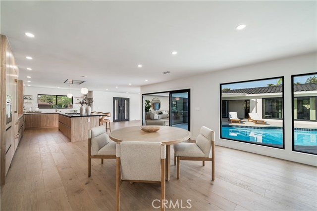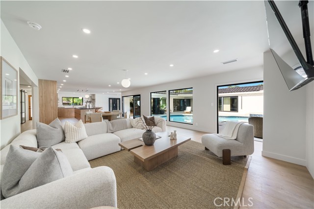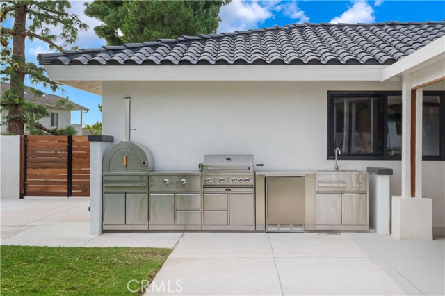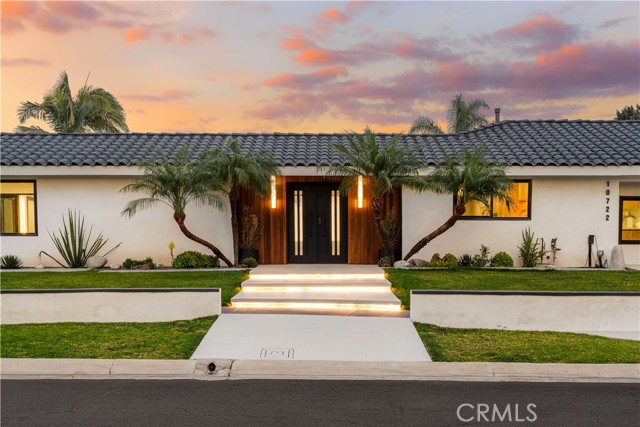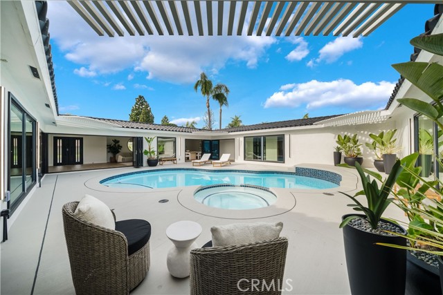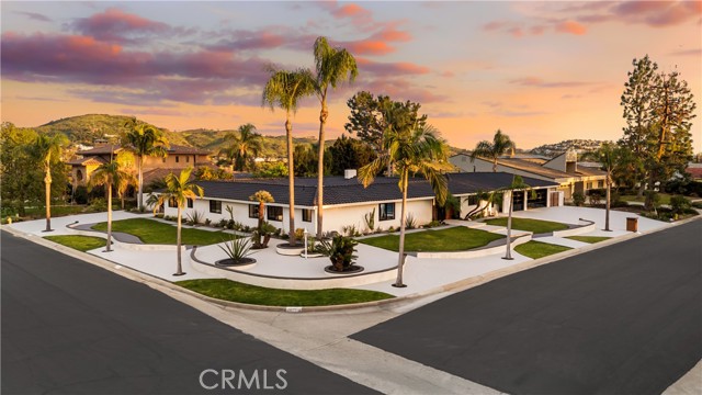 Rare, architecturally distinctive single-level estate on a half-acre corner lot of a double cul-de-sac in Villa Park, just a short walk to Villa Park Elementary School. Completely reimagined in a recent, fully permitted down-to-the-studs renovation, this 5-bedroom, 4.5-bath home with a dedicated office offers 4,535 sq ft of refined living with a layout seldom found in Orange County. At the center of the home is a striking square outdoor atrium, enclosed on all four sides by the residence and visible throughout. The atrium features a private heated pool and is accessed via expansive bifold and multi-slide glass doors from multiple rooms, creating seamless indoor-outdoor living while maintaining privacy. Large windows on all sides frame the courtyard, making it a constant focal point from the main living areas. A built-in projector and screen, viewable from the kitchen and living spaces, allow for poolside movie nights and entertaining. Designed for both comfort and flexibility, the home features a primary retreat plus a separate in-law suite, easily functioning as dual primary bedrooms. The single-story layout offers no interior steps and includes individual climate control in each bedroom, complemented by central heating and cooling for the main living areas. A private office adds functionality for remote work or executive use without disrupting the home's open flow. The kitchen is equipped with Sub-Zero and Thermador appliances, porcelain countertops, and European fixtures, opening naturally to the living and dining areas and the atrium beyond. Bathrooms feature Porcelanosa finishes, Italian and European fixtures including Brizo, and the home is completed with engineered hardwood flooring throughout. Outdoor amenities include a fully equipped outdoor kitchen with pizza oven and gas grill, heated pool, hillside views of the Orange Hills, and mature landscaping including an orange tree. A three-car garage with a four-car driveway is complemented by an additional separate driveway suitable for RV or multiple vehicle parking, complete with sewer cleanout for RV hookups. A rare combination of architectural character, modern luxury, and resort-style living, offering a lot configuration, floorplan, and atrium-centered design seldom available in the market. For added convenience, Villa Park Elementary is also a short walk away.