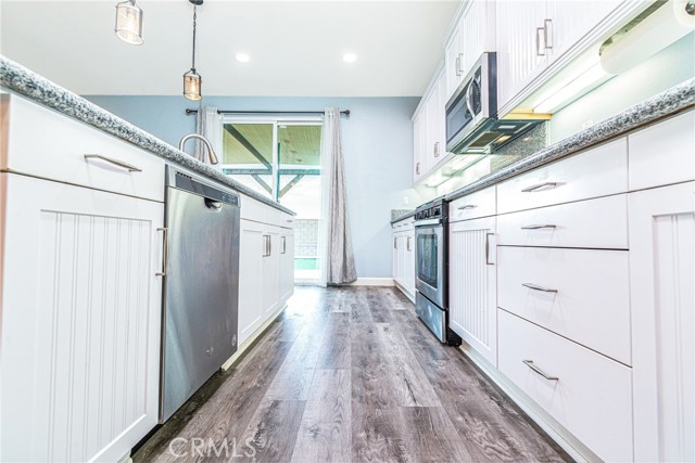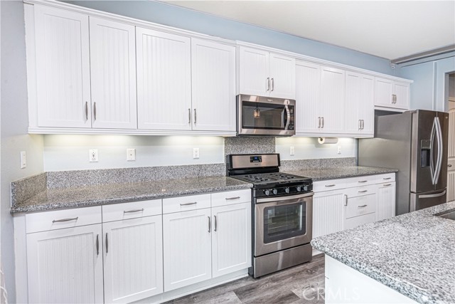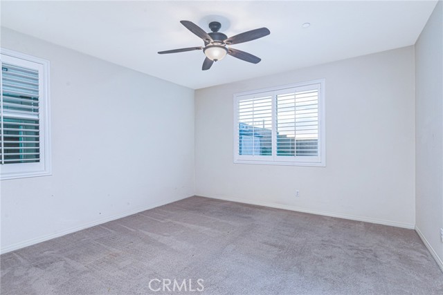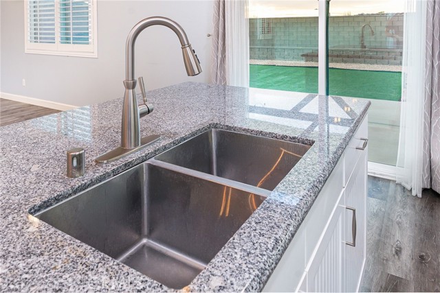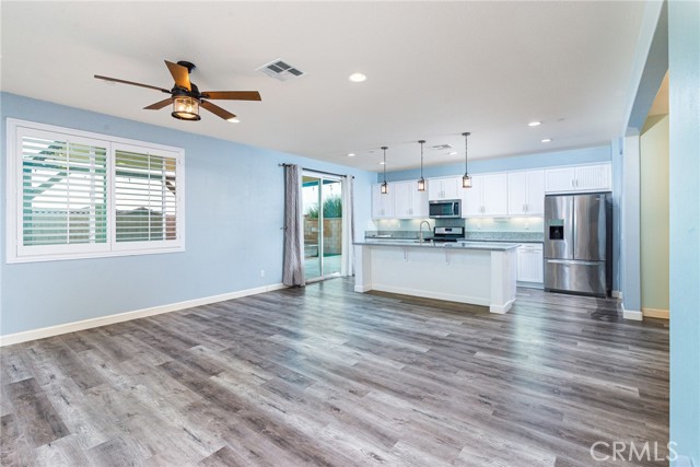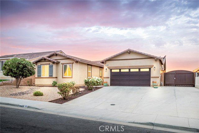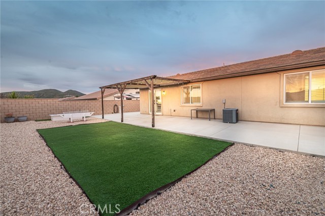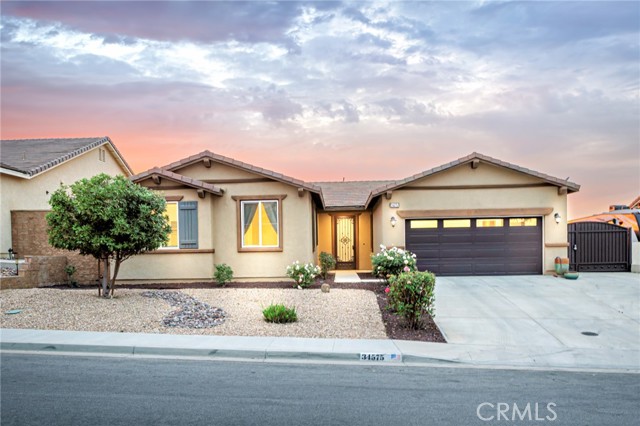 Here's the home you've been looking for! Single story + RV parking + Private Backyard with huge views! This beautiful home features a modern open-concept floor plan with beautiful plank flooring, contemporary kitchen with white "cape cod" style cabinetry, stainless appliances, slab granite counters and tastefully updated hardware including 3 beautiful pendent lights above the kitchen island and upgraded dining area light fixture. The large living area is perfect for modern living with the entire kitchen/family room/dining room joined together in one large area. The two secondary bedrooms are located up front and far from the master suite and feature ceiling fans and custom paint. The hallway features a large "flex room" that can act as a second living room for kids, an office, or whatever you might need the extra space for. The master suite features a large bathroom and a massive walk-in closet. The private back yard is huge and very private with no neighbors able to see into your yard and it features a spacious patio area, patio cover, artificial turf, large planter area and a storage shed. Perhaps the best part is the panoramic views to the west! This home also features a deep RV parking pad with lockable gate, and water/sewer hookups for your RV. The owner also pre-plumbed conduit and installed an outlet for 30AMP electric service (you will need to run wiring to complete.). Additional upgrades include a Quiet Cool whole house exhaust fan to help save on A/C costs in the summer; custom security doors, additional garage storage, window shutters along with custom interior paint. Built in 2017 this home sports loads of energy efficient features that are capped off by a PAID FOR solar panel system and tankless water heater. Located in Heritage Ranch, this home is close to walking trails, a sports park and is just minutes from shopping and freeway access as well as walking distance to the Menifee School District's coveted Harvest Hills STEAM Academy. Hurry, this highly desirable property won't last!