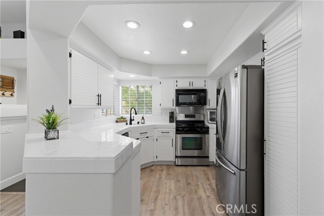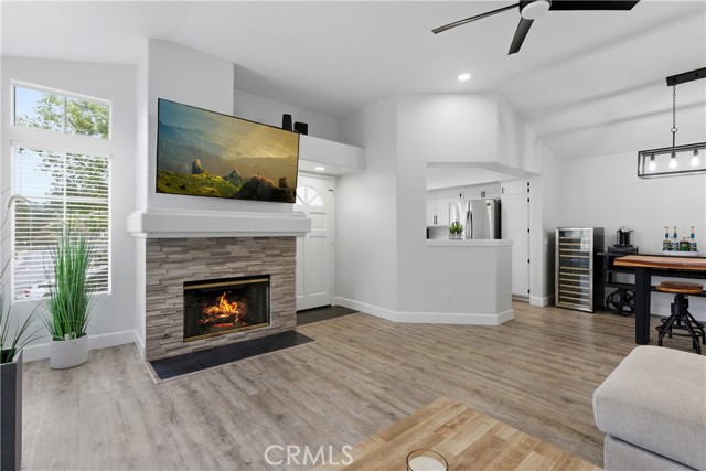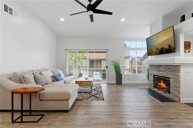 Bright, airy end-unit in one of Anaheim Hills most appealing communities! Located in Laurelwood at Sycamore Canyon, this 2-bedroom, 2-bathroom condo offers a single-level layout with no neighbors above or below. Vaulted ceilings run throughout the main living areas, giving the open-concept design an expansive feel. The living room features a cozy fireplace and sliding doors that open to a balcony, bringing in great natural light and easy indoor-outdoor flow. The kitchen is light and bright with stainless steel appliances. The primary bedroom includes a private en-suite full bathroom and its own balcony access overlooking the well-kept neighborhood. You will also enjoy convenient in-unit laundry, ceiling fans, and an attached 2-car garage. The Laurelwood community offers pools, spas, and walking paths just outside your door. Restaurants, cafes, shopping, and groceries are all close by, and Sycamore Park and its playground are just around the corner. A home that feels both tucked away and perfectly connected.