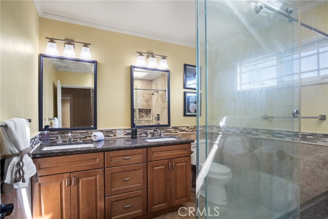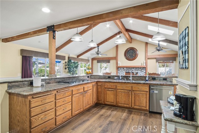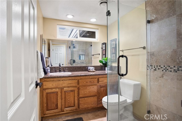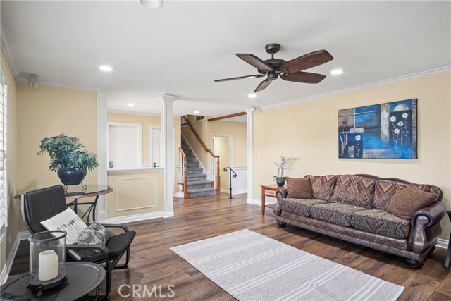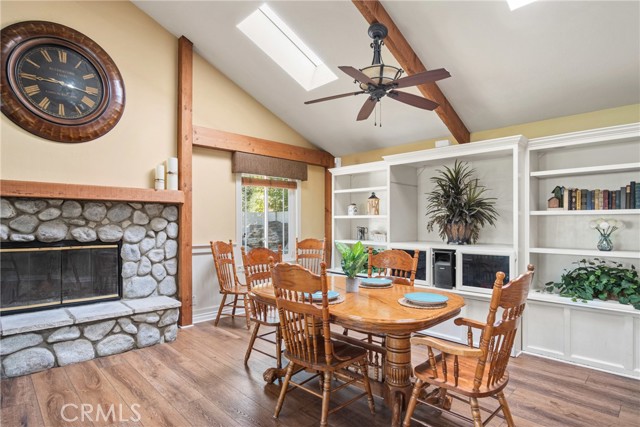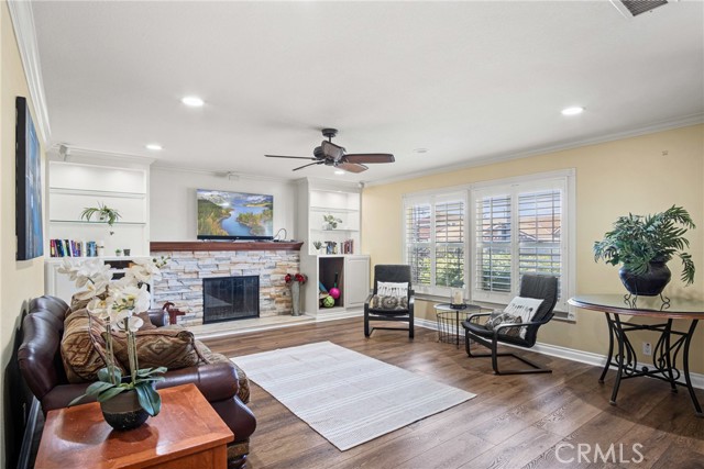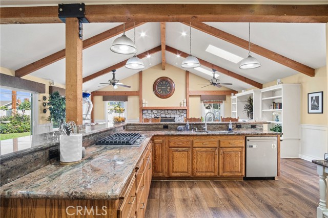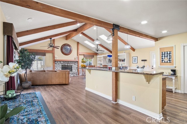 PRIME CYPRESS LOCATION HOME AWAITS ITS NEXT FAMILY! This upgraded, freshly painted expansive home on a beautiful street in Cypress is available for the first time in decades! Don't miss out! The curb appeal is quite evident as you arrive. There is a large concrete driveway able to accommodate 4 cars and there is a 2-car garage, as well. There are three lovely brick planters/flowerbeds, a brick patterned walkway and the foliage is fresh and well cultivated, showing obvious pride of ownership. As you step in the front door, you're met with the first of two living areas (BOTH boasting fireplaces...such a luxury in California nowadays). This living room has plantation shutters and a stacked stone fireplace flanked by built-in bookshelves and storage, as well as a wood mantle. Canned lighting and laminate floors run throughout the first floor, along with upgraded windows. The massive kitchen has warm-toned cabinets, drop down pendant lights and granite countertops with a bar for stool seating. This opens up to the second living area, a huge den that boasts high vaulted ceilings with massive rustic beams, two drop down ceiling fans, two skylights, and an amazing river rock hearth and mantle. Off the kitchen is a dedicated laundry room with more storage cabinets, and a convenient powder room. Don't like to climb the stairs to go to bed? No worries! This home has a first floor master bedroom and upgraded full bath showcasing travertine tiles, glass door shower enclosure, and granite countertops. All three upstairs bedrooms are freshly painted and have ceiling fans. The hall full bath is quite large with a double sink vanity topped with granite, travertine tile, glass shower enclosure and a spa tub! The garage is currently being used as an office, and the floors are tiled with a durable black and white tile made to withstand a car's weight. The back yard off the den has well-manicured grass, a wood awning covered patio perfect for BBQs and quiet dinners, a second patio area with large cobblestone like coverage for another place to rest or entertain which also has a small relaxing pond. This home is perfect for a large or multi-generational family living. The set up is awesome, the schools are amazing and the area can't be beat!