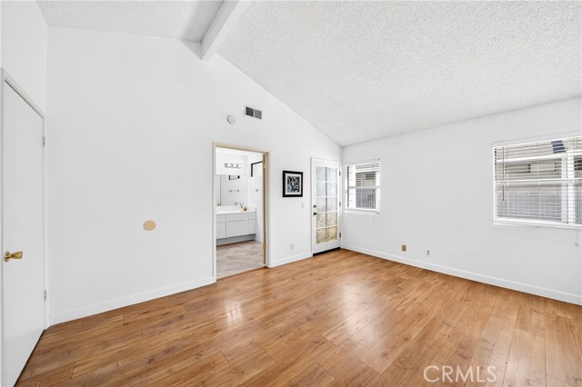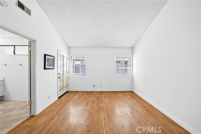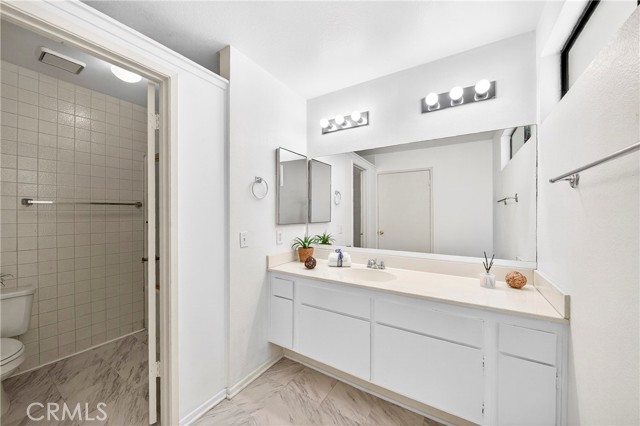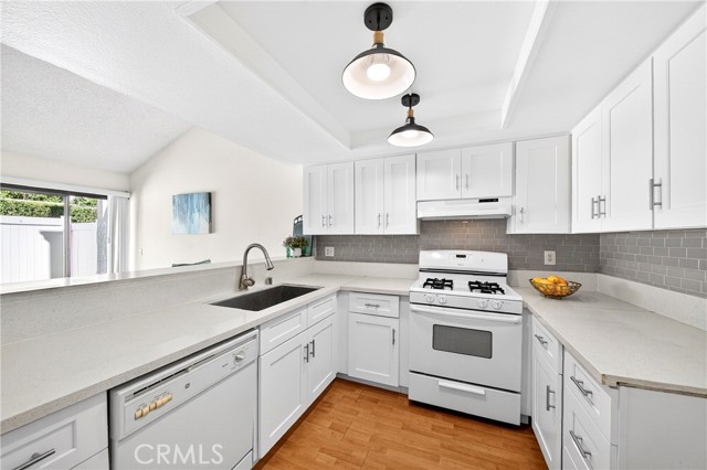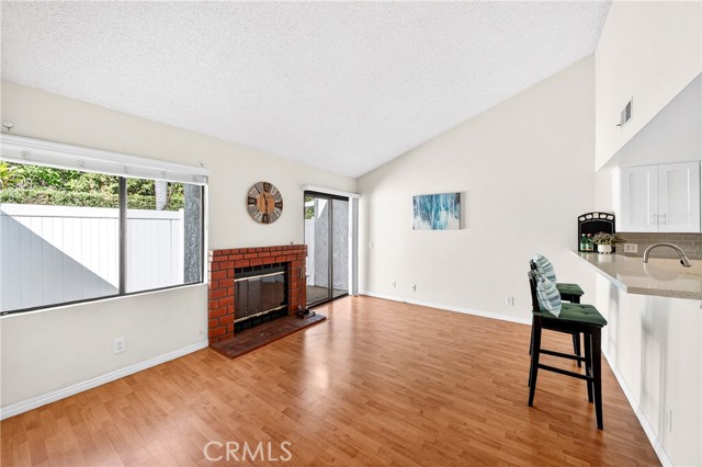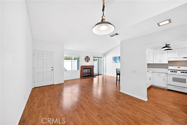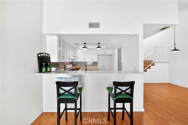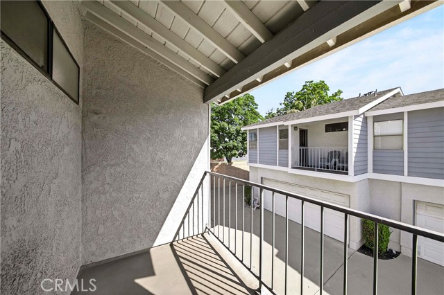 This beautiful home is a gated community, a spacious two-story townhouse with a two-car attached garage and a bright, open layout. The living room features a cozy fireplace next door to the patio access, hardwood-style laminate flooring throughout the main floor, and a high-vaulted ceiling. Upgraded kitchen cabinets with quartz countertops, a tray ceiling, and a vanity with vinyl flooring. Upstairs, the primary bedroom offers a private dressing area, an en-suite full bathroom, and a cozy balcony. The ample-sized bedroom and walk-in shower bathroom in the corridor. The amenities include a swimming pool and a Jacuzzi, and the community is conveniently located near freeways 605 and 5, with restaurants, shopping, and markets nearby.