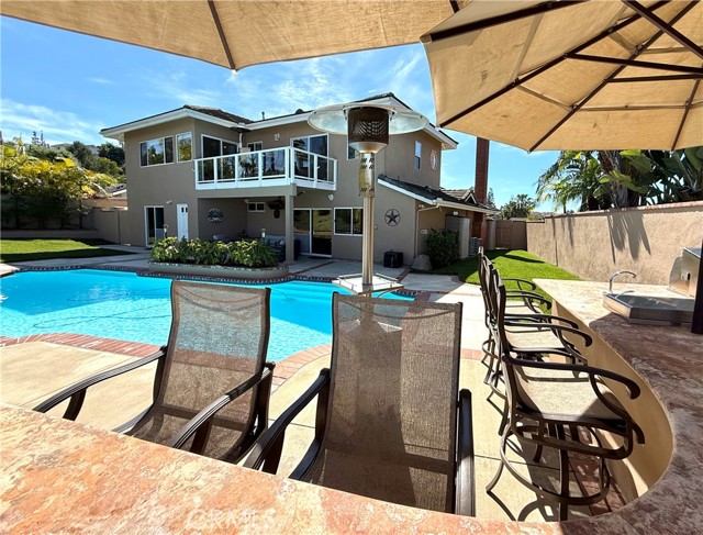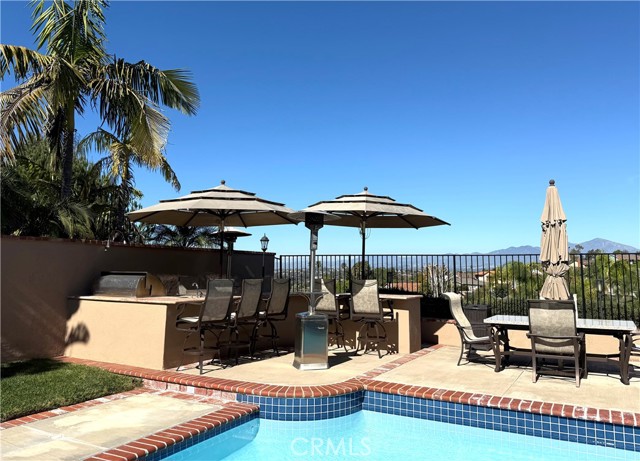 Stunning custom-remodeled 5-bedroom, 4-bath home featuring a main level suite and a luxurious upper lever primary suite, with sweeping mountain views from nearly every room. Located in Laguna Niguel on a quiet cul-de-sac Street. Designed for both everyday living and unforgettable entertaining, this home offers breathtaking snow-capped mountain views in the winter and sparkling city lights in the evening. The expansive great room features a built-in bar complete with refrigerator, sink and even a dishwasher, which opens to a large deck — perfect for enjoying morning coffee or sunset views. The upstairs primary suite is a true retreat where you can wake up to panoramic views from every window. The en-suite bathroom features granite counters on dual vanities, a jacuzzi tub, and a spacious walk-in shower. Downstairs, the second primary suite — currently used as an office — includes a walk-in closet, en-suite bath, and direct access to the private backyard oasis with pool and spa. The exceptionally private backyard is built for entertaining, complete with a sparkling pool and jacuzzi, resurfaced in 2023, plus a fully equipped outdoor kitchen featuring travertine countertops, a large grill, cooktop, sink, refrigerator, granite countertops, a huge grass area and outdoor heaters for year-round enjoyment. The custom kitchen overlooks the pool and showcases solid wood cabinetry, a five-burner gas cooktop, built-in microwave, walk-in pantry, and inverter linear refrigerator (included). Enjoy seamless indoor-outdoor living with direct access to the covered patio with a built-in gas heater. Additional highlights include a custom fireplace in the living room, a bonus storage area under the staircase that could serve as a wine cellar, and built-in surround sound throughout the home and backyard. Four bedrooms are located downstairs, along with a laundry room with washer and dryer included and a large linen closet. The two-car garage offers built-in cabinetry, a workbench and attic storage. There is RV parking along the side of the home and space for three cars in the driveway. Energy-efficient upgrades include owned solar, a new tankless water heater, and dual-zone A/C for both levels. Ideally located in Laguna Niguel with NO HOA, just minutes from Dana Point Harbor and some of Southern California's most beautiful beaches. DON'T MISS THE HOME TOUR VIDEO COMING SOON.