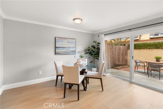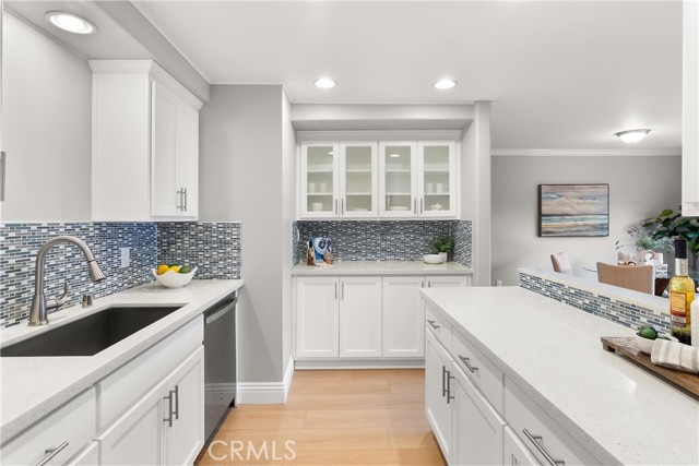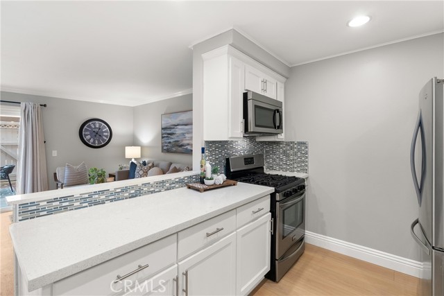 Huntington Beach move in ready downstairs unit with a large enclosed patio and no stairs, featuring brand new luxury vinyl flooring, recessed lighting, smooth ceilings, fresh designer paint, and crisp 5 inch baseboards with crown molding for a bright, finished look throughout. The updated quartz kitchen is both stylish and functional with custom cabinetry, stainless steel appliances, a farmhouse sink, designer tile backsplash, and a decorative chandelier that sets the tone for everyday living and entertaining. The spacious primary bedroom offers excellent storage, including three full sized mirrored closet doors plus built in dresser and cabinetry for effortless organization. The private ensuite bathroom showcases designer fixtures and custom tile finishes, creating a clean, spa inspired retreat. One of the standout lifestyle advantages is the ground level location, delivering easy access and a large enclosed patio that feels like an extension of the living space. Perfect for morning coffee, quiet evenings, or a bit of outdoor living without the upkeep. Additional storage adds everyday convenience. Residents enjoy community amenities including a sparkling pool, recreation room with pool table, and on site laundry. Monthly utility costs are simplified and often reduced because HOA dues include gas, water, trash, and sewer, offering meaningful built in savings and easier budgeting. Ideally located near the best of Huntington Beach, including a short drive to world renowned beaches, wetland walking trails, epicurean dining, and shopping. Enjoy quick access to Meadowlark Golf Course and driving range, plus neighboring parks for outdoor time year round. A great opportunity to enjoy comfort, style, and a low maintenance coastal lifestyle.
