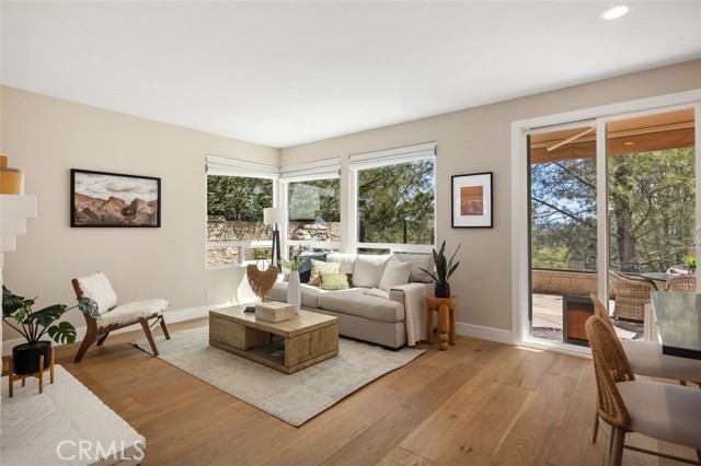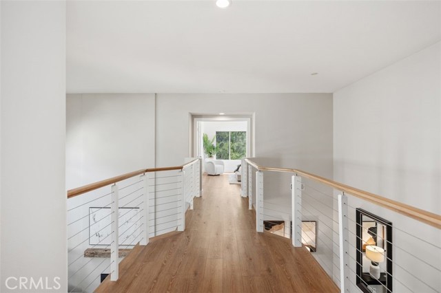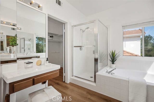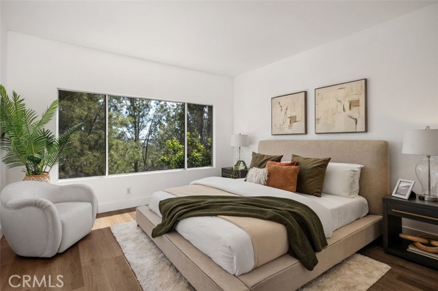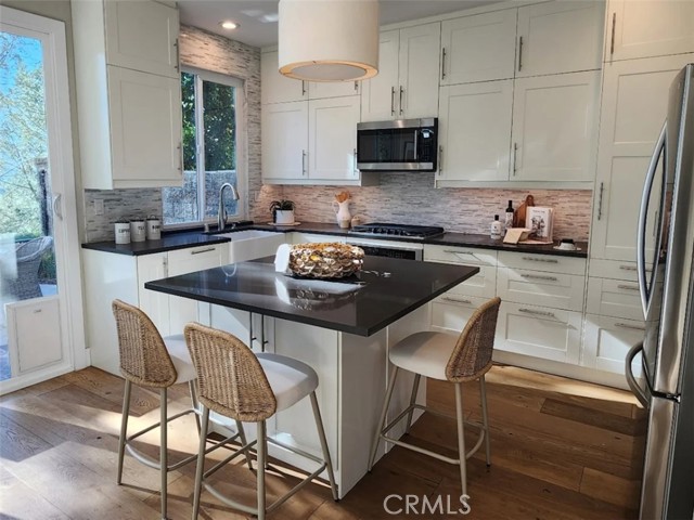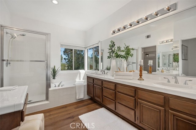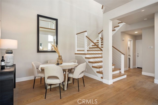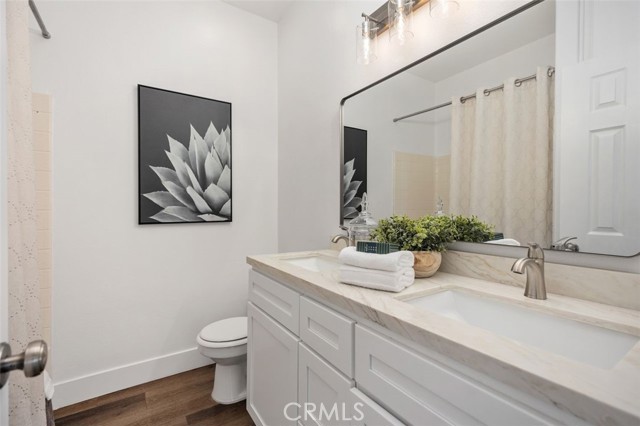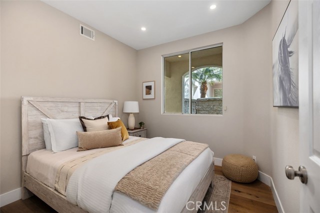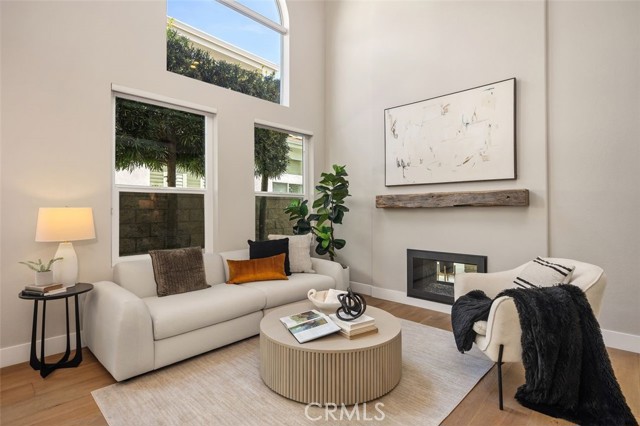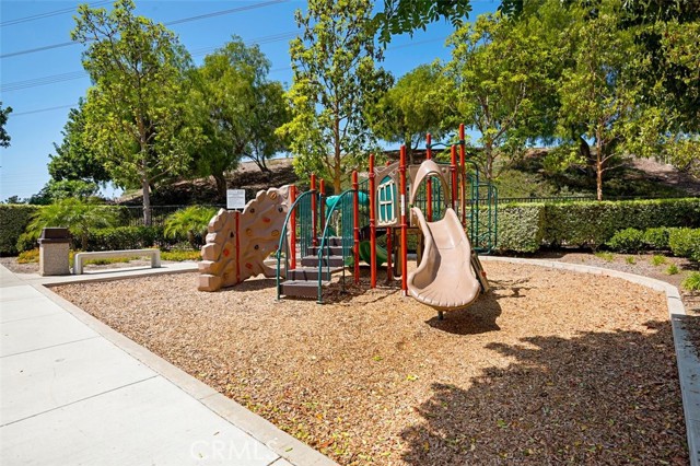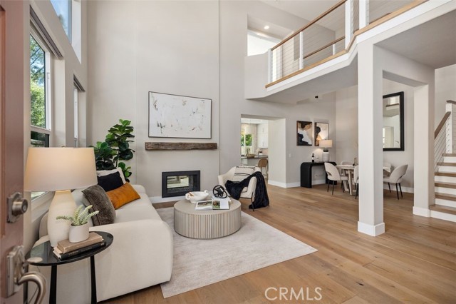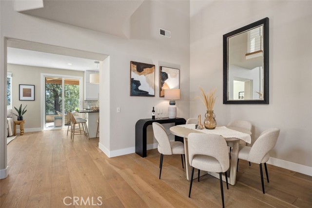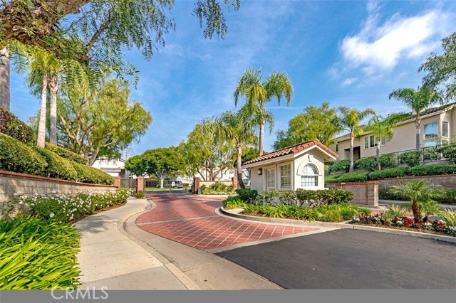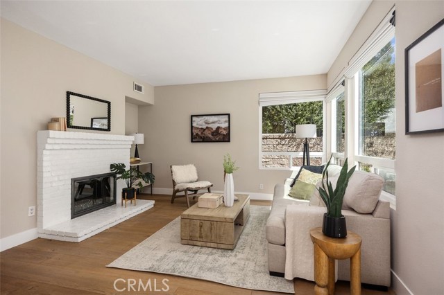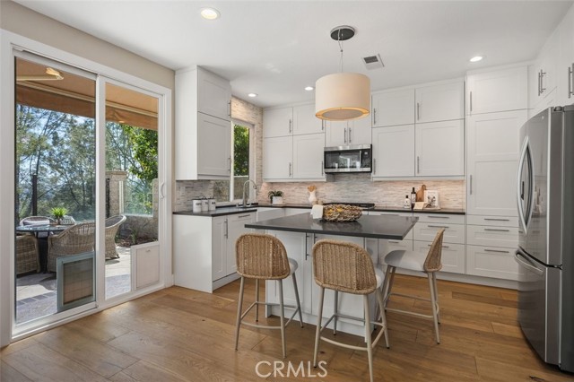 Panoramic views, a rare downstairs bedroom and bath, and a beautifully remodeled kitchen highlight this spacious 5-bedroom home in the gated community of Eagle Pointe in Aliso Viejo. Offering approximately 2,186 square feet, this single-family attached residence combines an open floor plan with thoughtful upgrades and an ideal location. Step inside to a light-filled living room with vaulted ceilings and a dramatic see-through fireplace that creates an open, airy feel as you enter the home. The main level features a versatile layout with a formal dining area and a comfortable family room, all finished with wide plank wood flooring and updated windows streaming natural light. The family room shares the fireplace with the living room and opens directly to the remodeled kitchen, creating a welcoming space for everyday living and entertaining. The kitchen features quartz countertops, shaker-style cabinetry, custom mosaic tile backsplash, and stainless steel appliances. Sliding doors lead from the family room to a low-maintenance backyard designed to enjoy the panoramic city and Saddleback Mountain views. A retractable awning adds shade and comfort for outdoor dining or relaxing. A rare full bedroom and bathroom on the main level provide excellent flexibility for guests, multigenerational living, or a private home office. The bathroom includes travertine flooring and a walk-in shower with travertine backsplash. A contemporary staircase with cable railing leads to the upstairs with a spacious primary suite featuring double-door entry, high ceilings, and the same sweeping views seen from the kitchen and family room. The en-suite bathroom offers a separate tub and shower, a vanity area, and an oversized walk-in closet with built-in organizers. Two additional secondary bedrooms are located on the opposite side of the upper level, both with built-in shelving, including one with a walk-in closet. An enclosed office with a closet (currently with built-ins) can easily serve as a fifth bedroom. The upper level also includes a secondary bathroom with dual sinks and a full-size laundry room with abundant cabinetry. Eagle Pointe is a private gated community of duplex-style homes with its own pool and spa. Ideally located adjacent to Argonaut Park, the neighborhood is less than five minutes from the Aliso Viejo Town Center and the 73 Toll Road, about ten minutes to the 5 and 405 freeways, and approximately fifteen minutes to the sand at Laguna Beach.